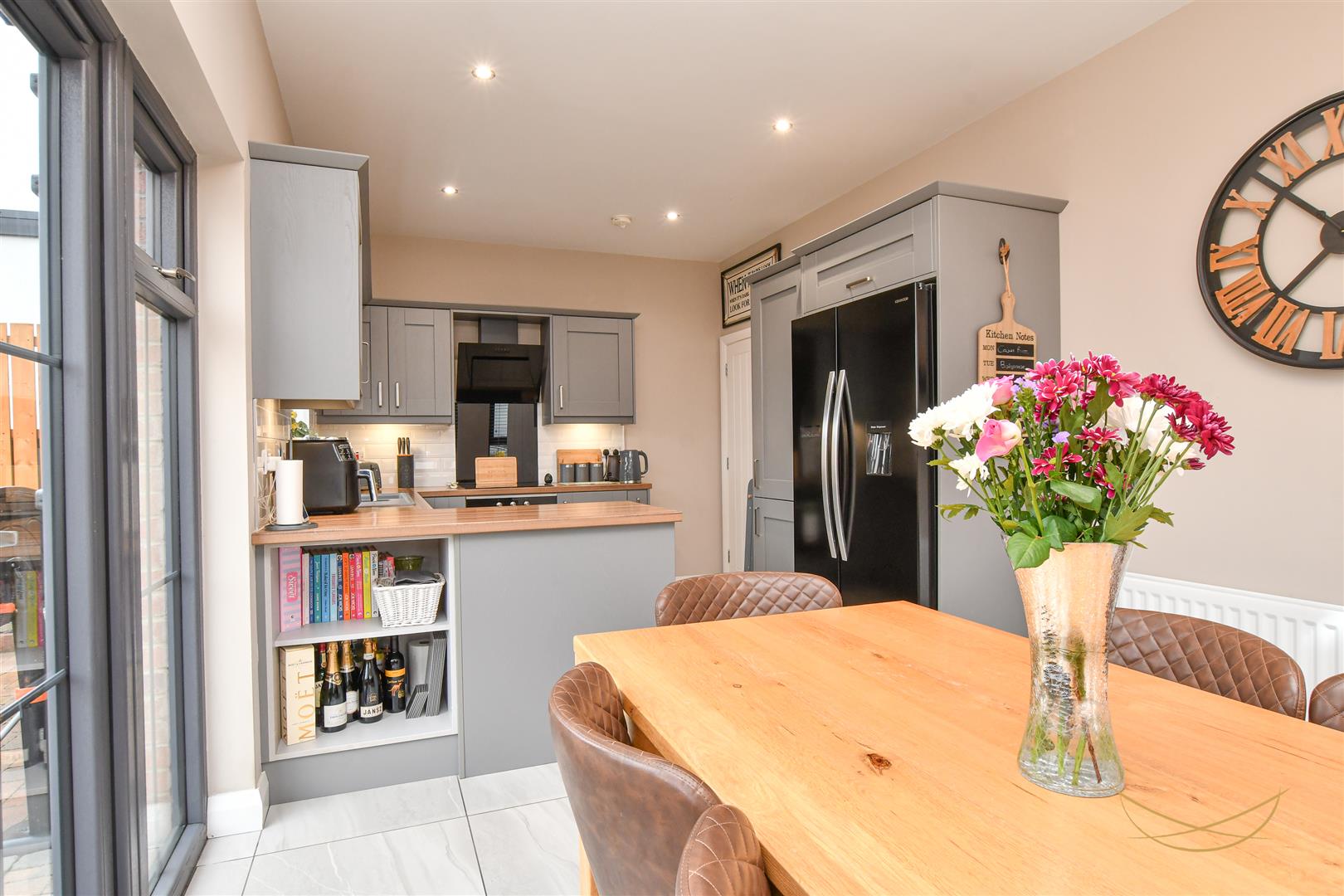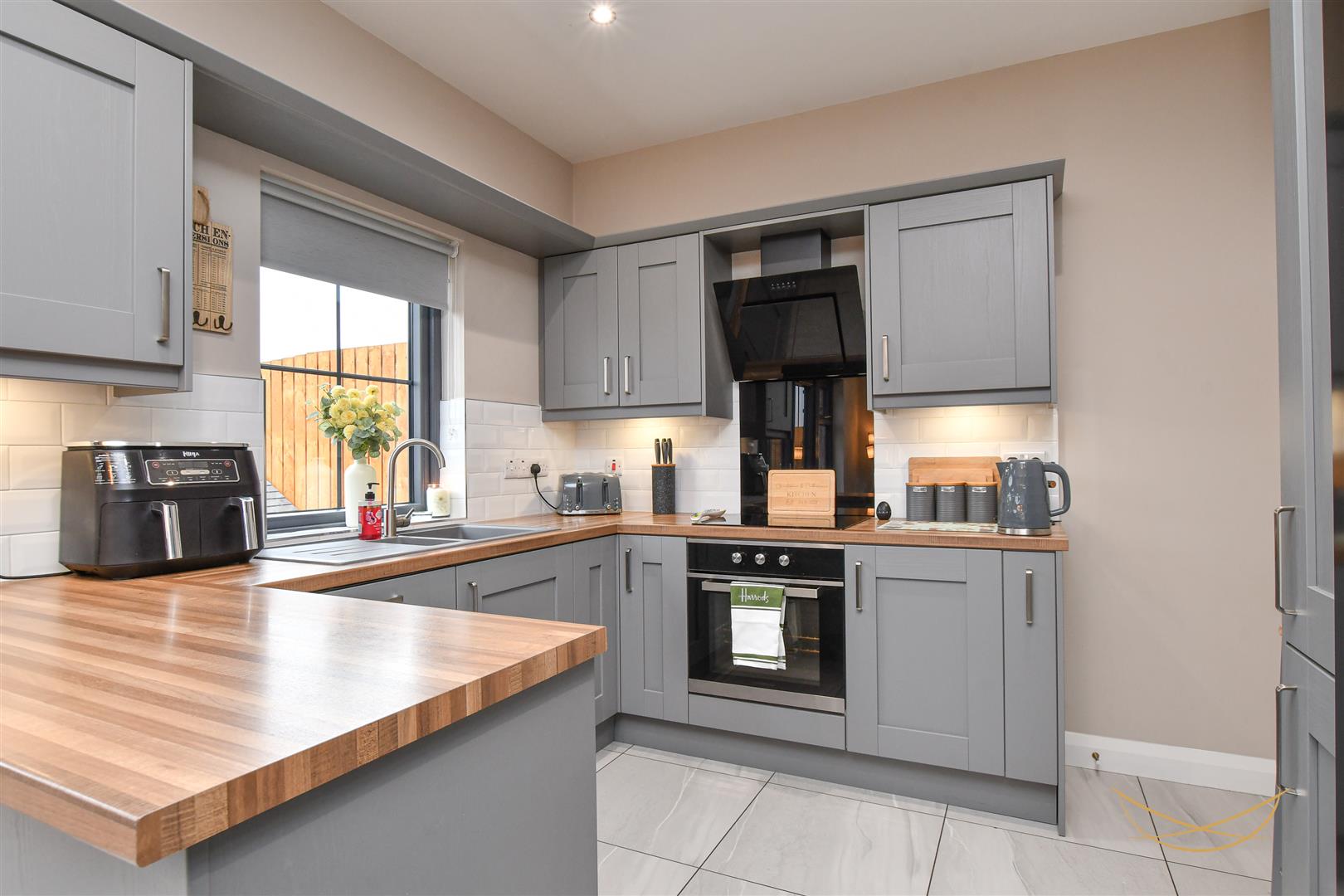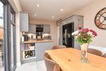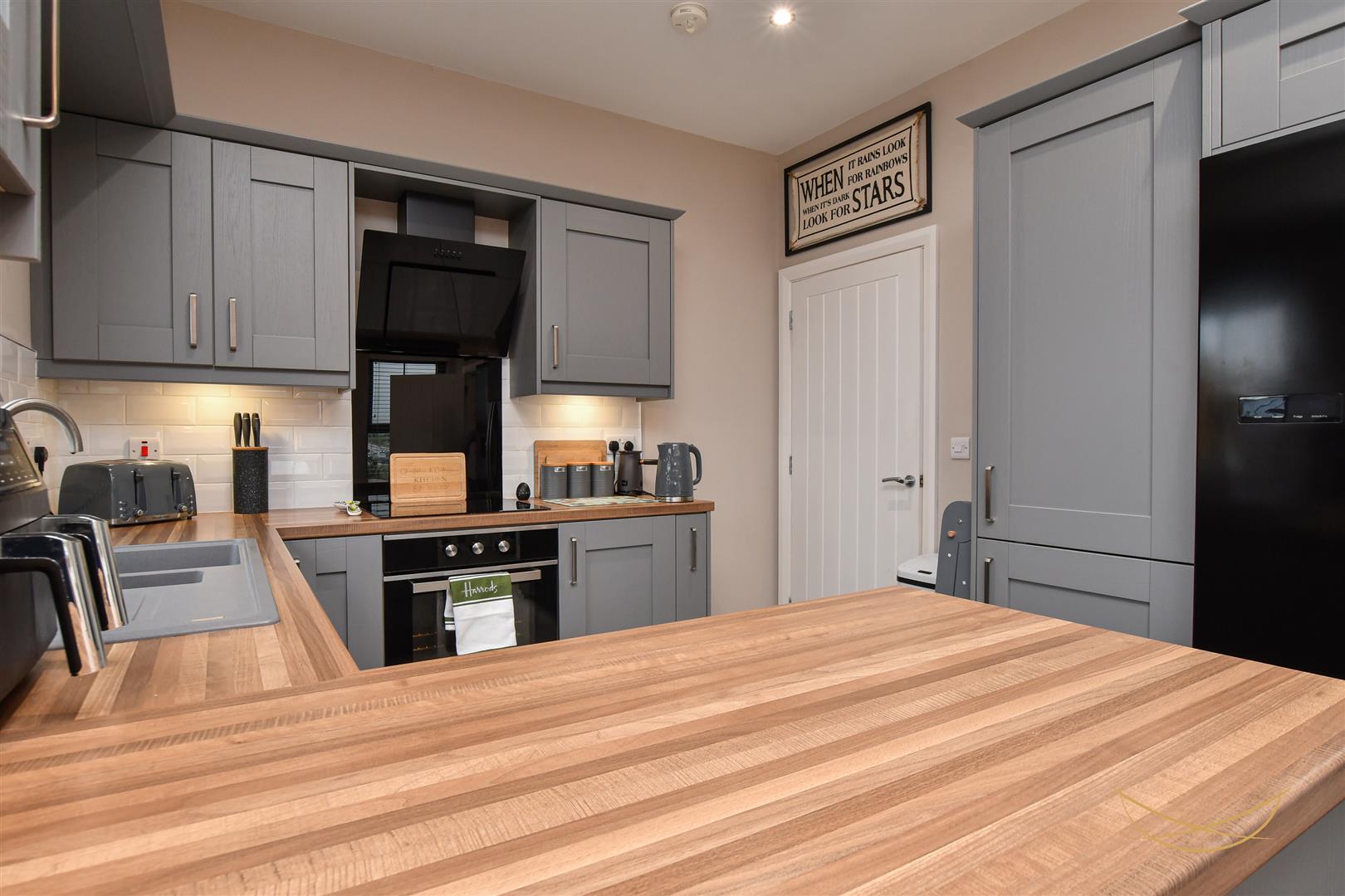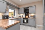 Shaker style kitchen with contrasting worktops. Composite 1.5 sink bowl with drainer and mixer taps. Integrated electric oven and hob. Integrated angled extractor fan. Space for American style fridge freezer. Tiled splashback. Patio doors opening to rear garden. Tiled flooring.
