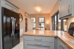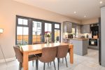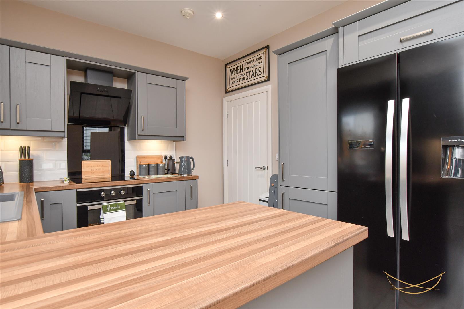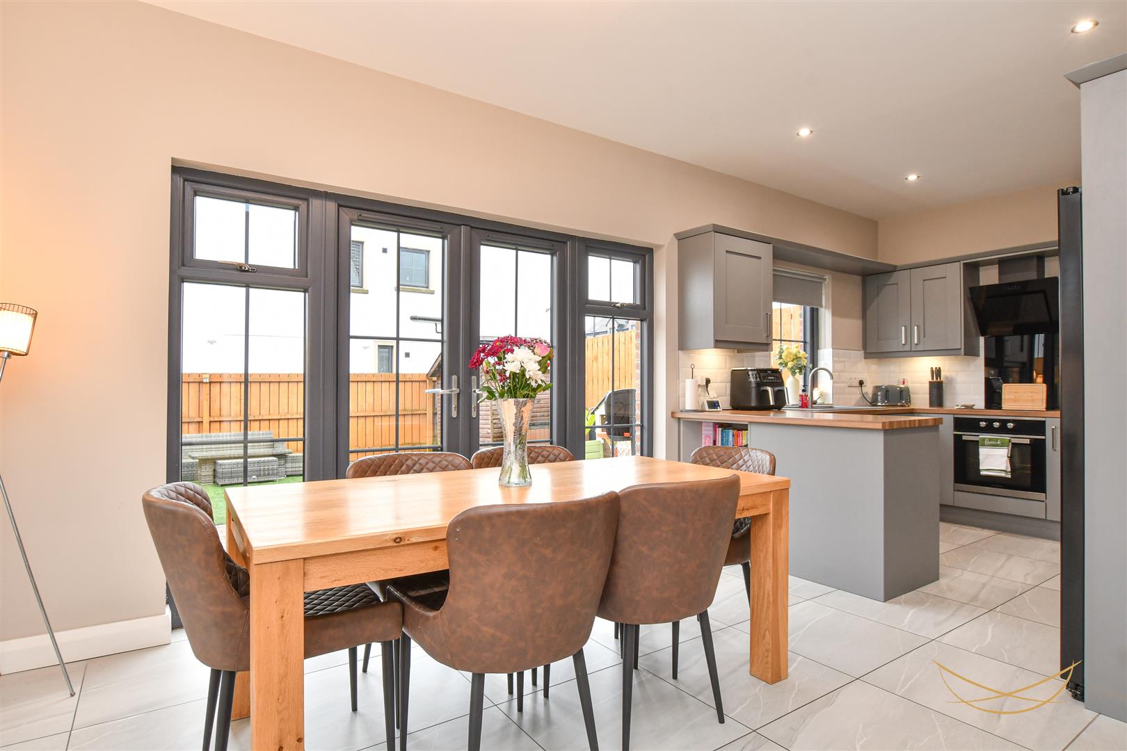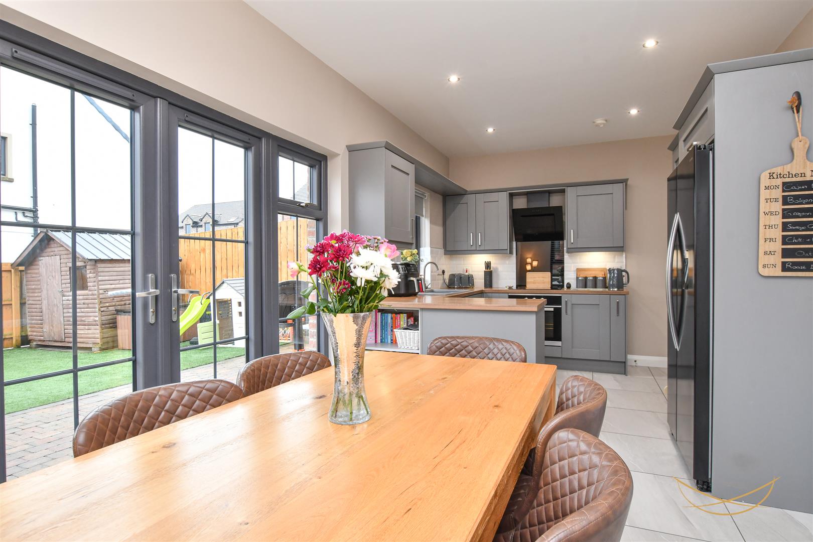 Shaker style kitchen with contrasting worktops. Composite 1.5 sink bowl with drainer and mixer taps. Integrated electric oven and hob. Integrated angled extractor fan. Space for American style fridge freezer. Tiled splashback. Patio doors opening to rear garden. Tiled flooring.