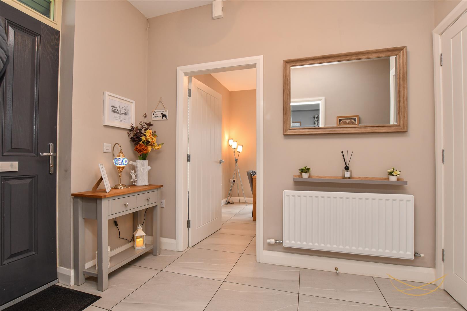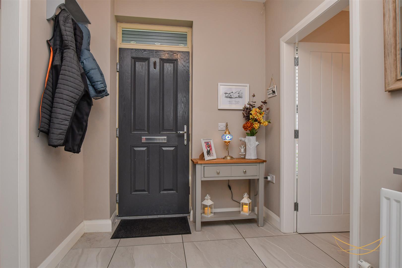 Composite front door with over glazed panel. Ceramic tiled floor.