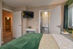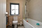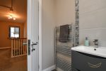 White suite comprising paneled bath with mixer taps, hand held and over rainfall shower. Vanity style sink unit with mixer taps. Heated chrome towel rail. Tiled splashback. Tiled flooring.