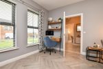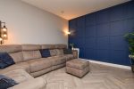 Herringbone effect laminate wood flooring. Feature wood paneling.