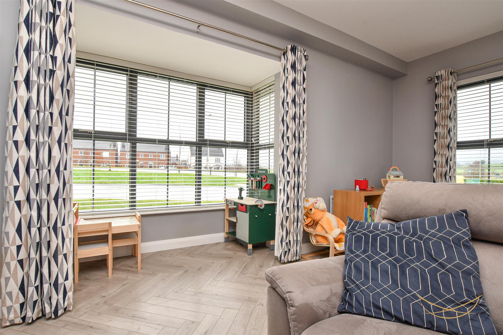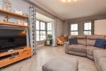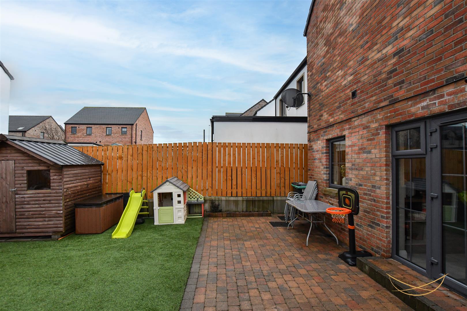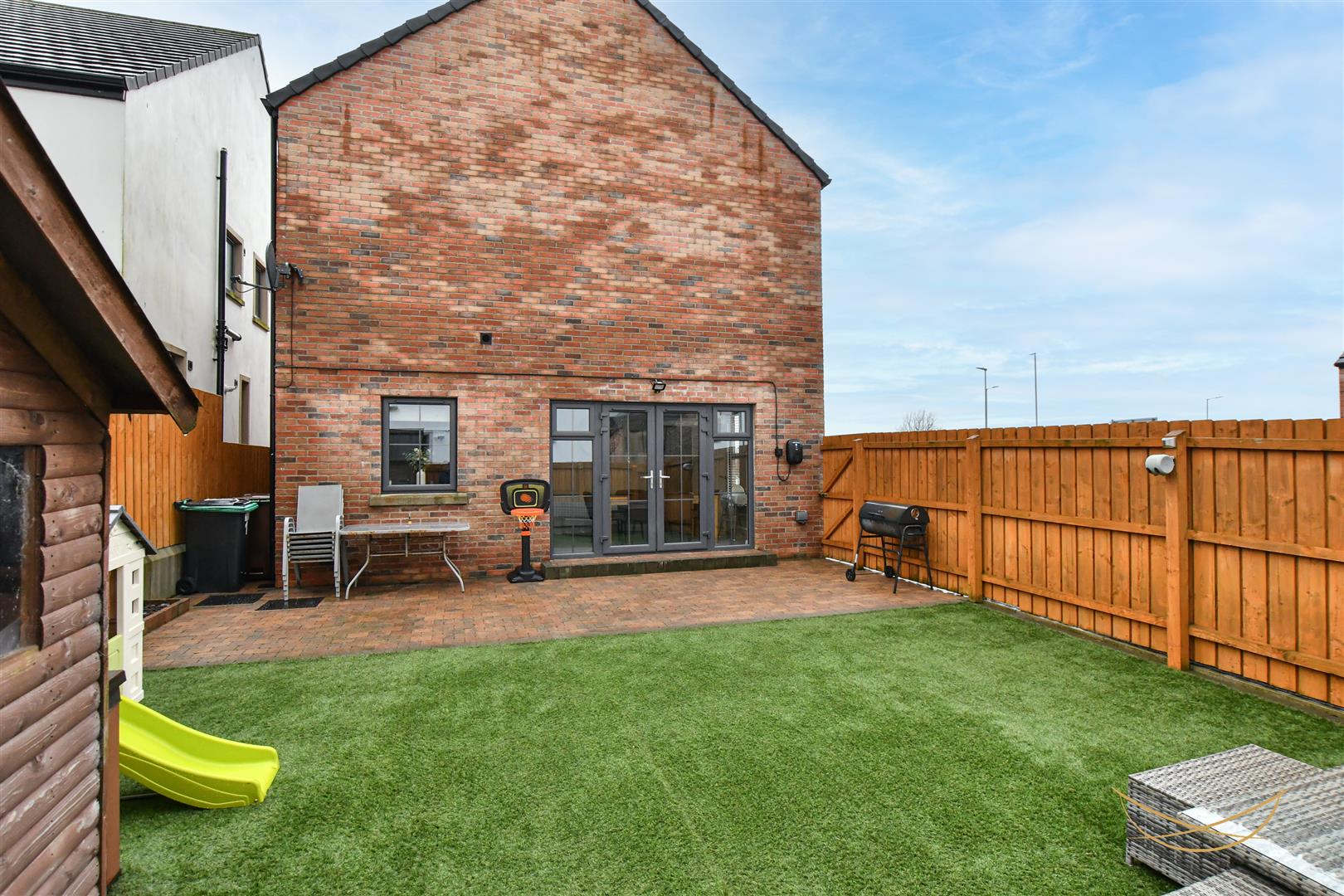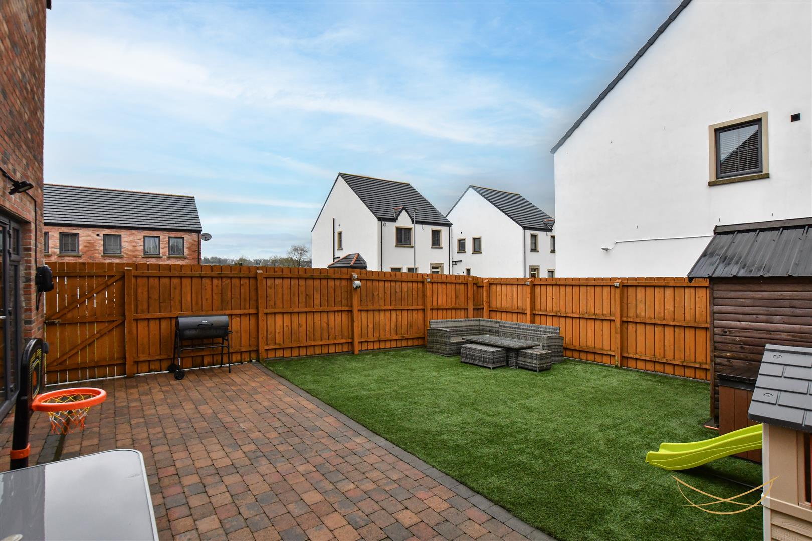 Enclosed side garden with artificial grass and feature paved seating area. Outdoor tap. Outdoor lighting. Wired for EV charger. Tarmac finished driveway for two cars.