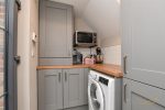 Range of high and low level units with contrasting worktops. Space for washing machine. Tiled splashback. Tiled flooring.