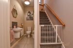 White suite comprising low flush W/C. Semi pedestal wash hand basin with mixer taps. Tiled splashback. Tiled flooring.