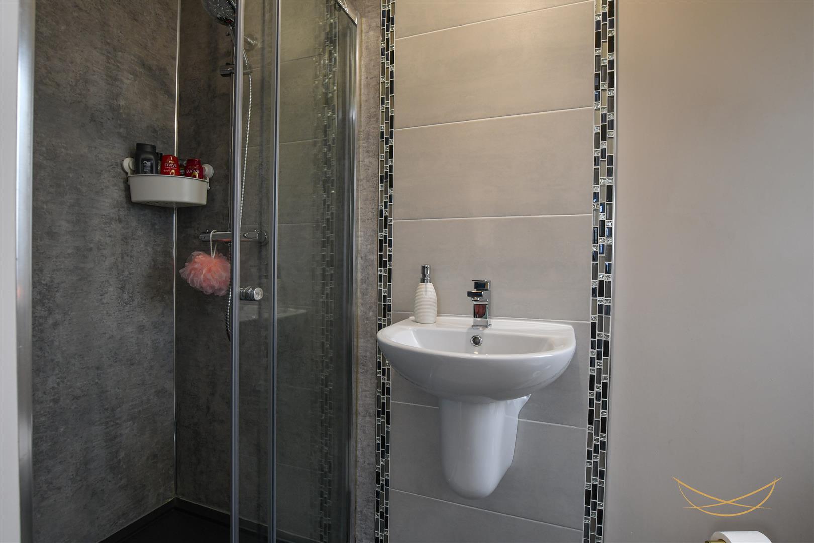 White suite comprising large enclosed mains shower. Low flush W/C. Semi pedestal wash hand basin with mixer taps. Tiled flooring. Tiled splashback.
