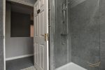 Modern white suite comprising large shower unit. Low flush W/C. Vanity style sink unit. Heated towel rail. Tiled walls. Tiled flooring.