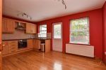 Range of high and low level units with contrasting formica worktops. Stainless steel 1.5 sink bowl unit with drainer with mixer taps. Integrated electric oven and hob. Integrated extractor fan. Space for washing machine. Space for fridge freezer. Access to storage. Access to rear garden.