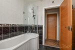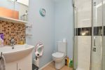 Three piece suite comprising enclosed tile shower. Low flush w/c. Vanity unit with ceramic basin. Tiled flooring. Mosaic splashback.
