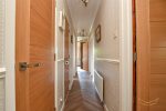 Quarry tiled step. Hardwood external door with glazed insets. Hallway with wood effect laminate flooring.