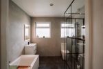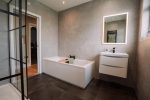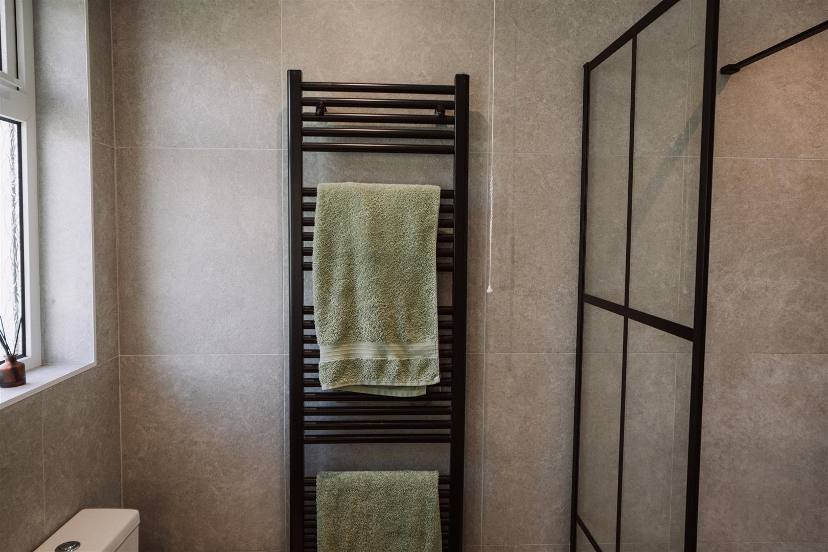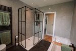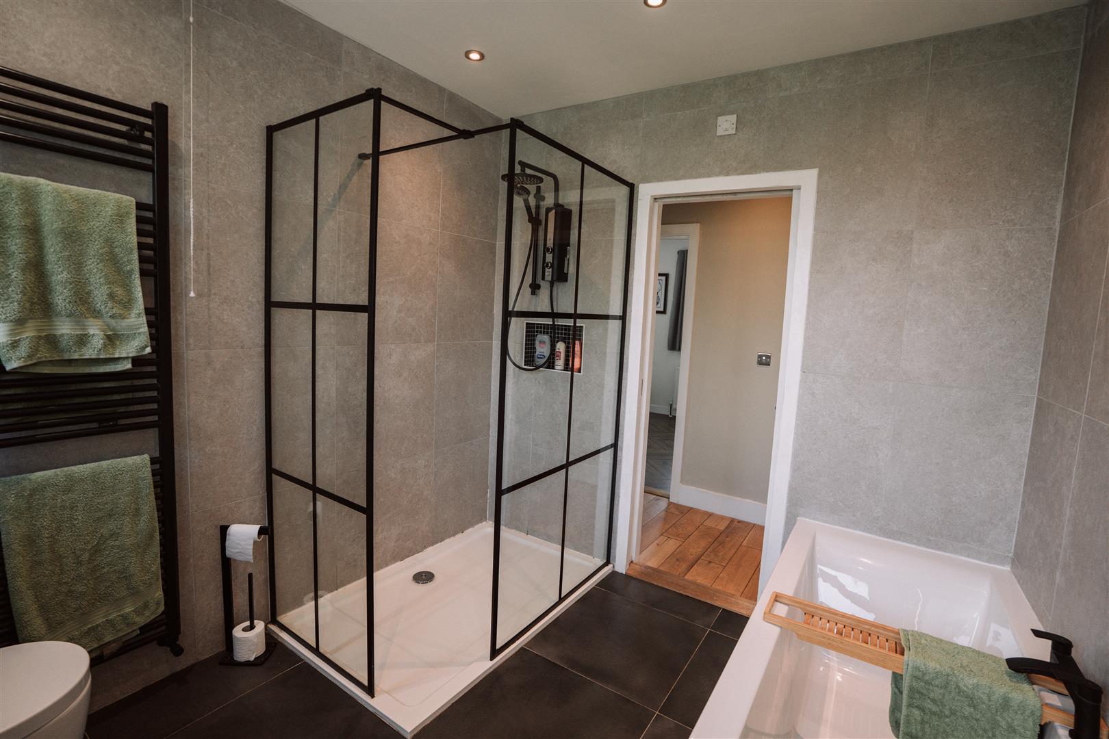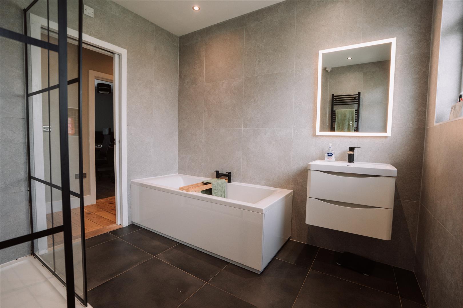 Contemporary four piece suite comprising panelled bath with mixer taps, floating vanity unit with integrated handles, seamless curved resin basin and black mixer tap. Low flush w/c. Large walk-in shower with electric rainfall unit and telephone attachment. Fully tiled walls. Tiled flooring. Recessed spotlights.