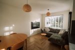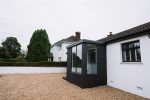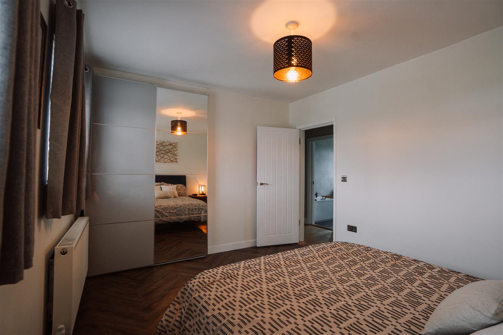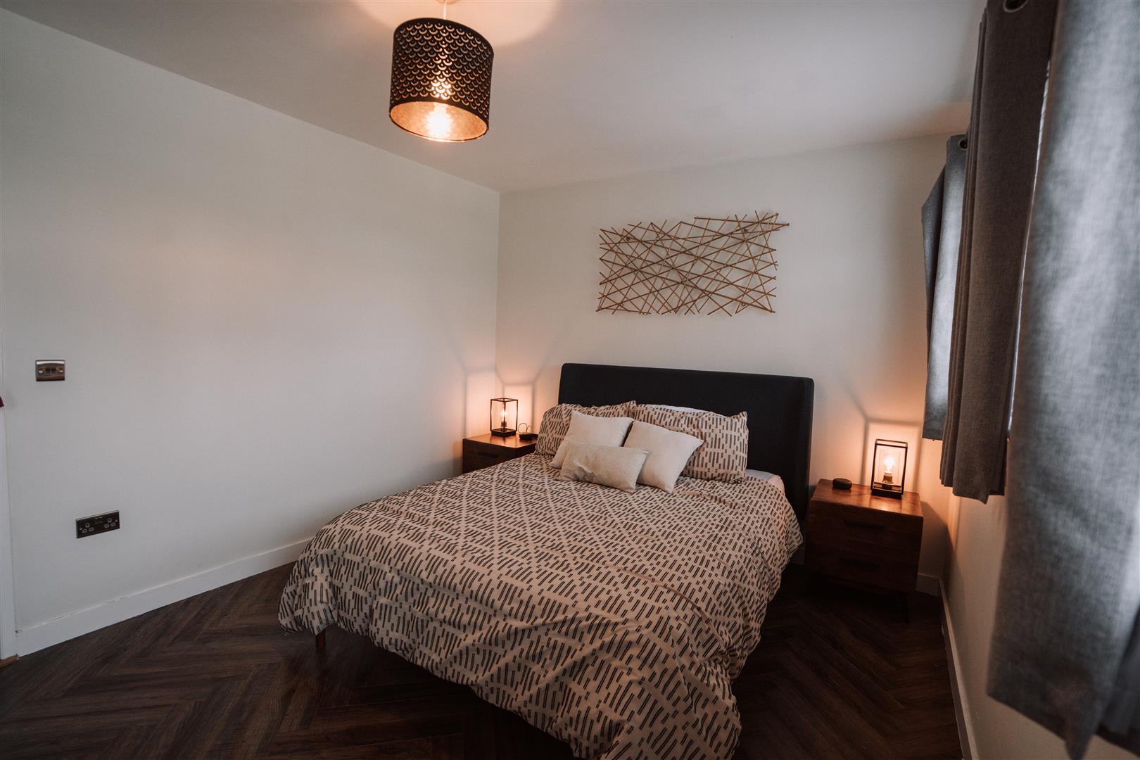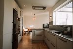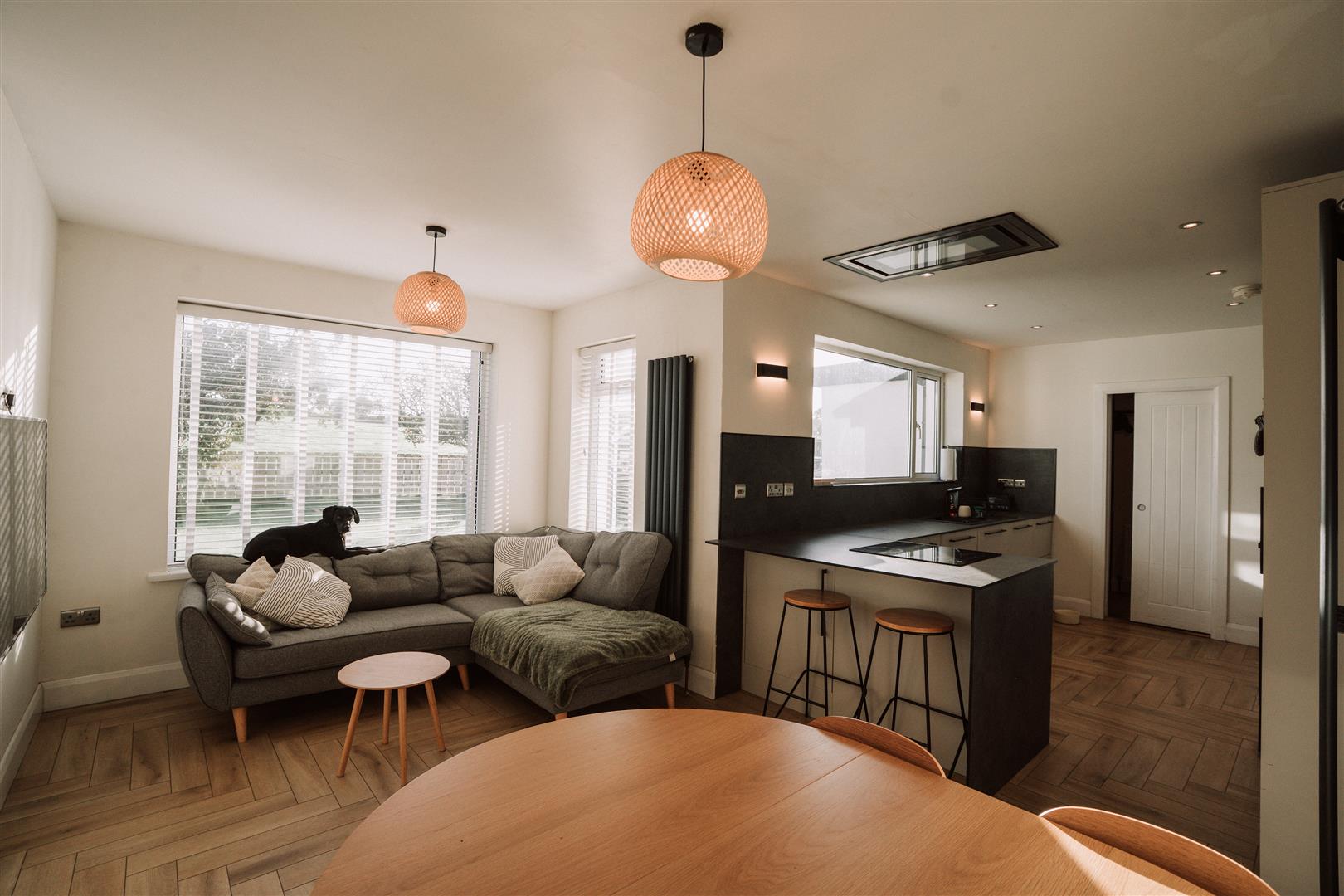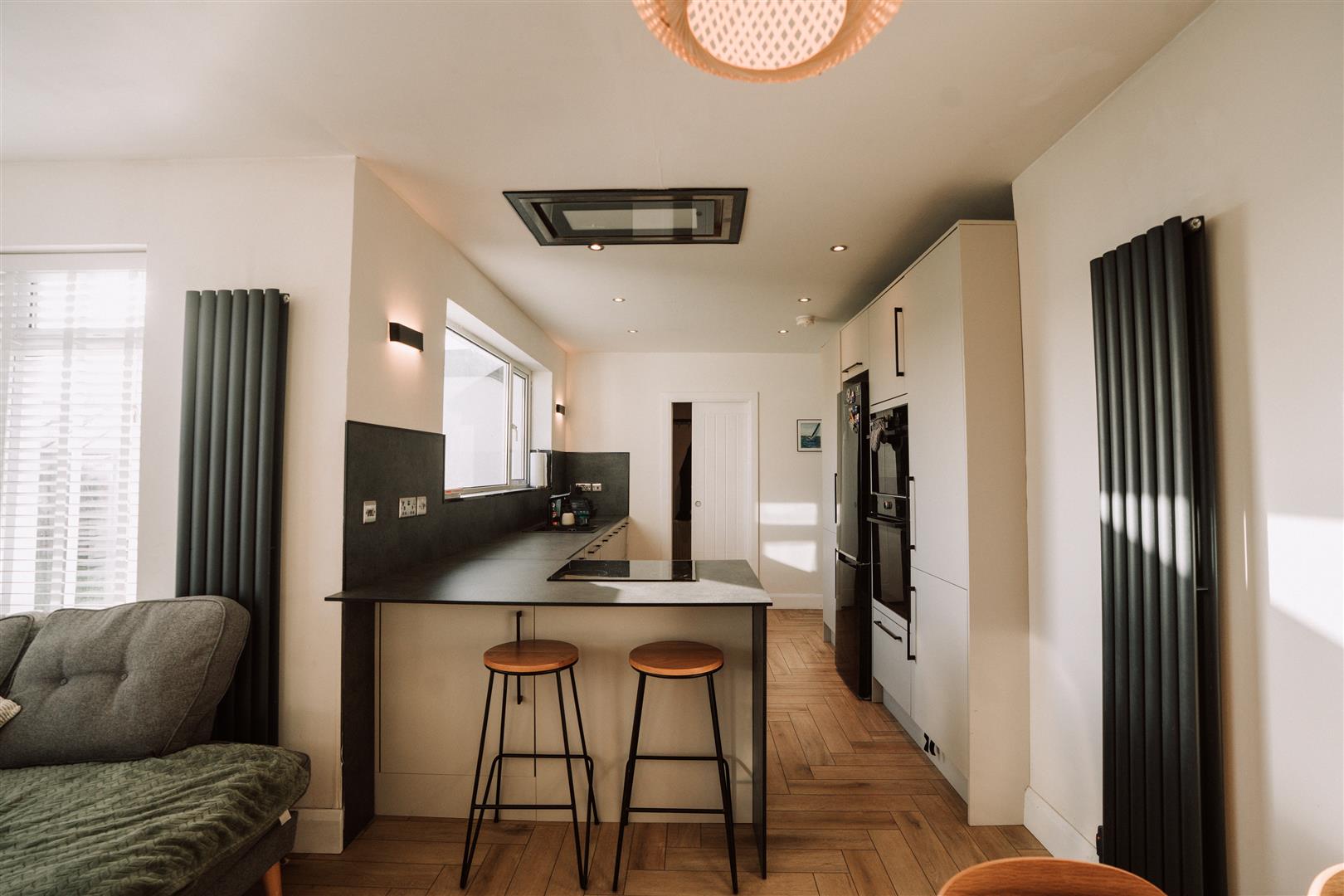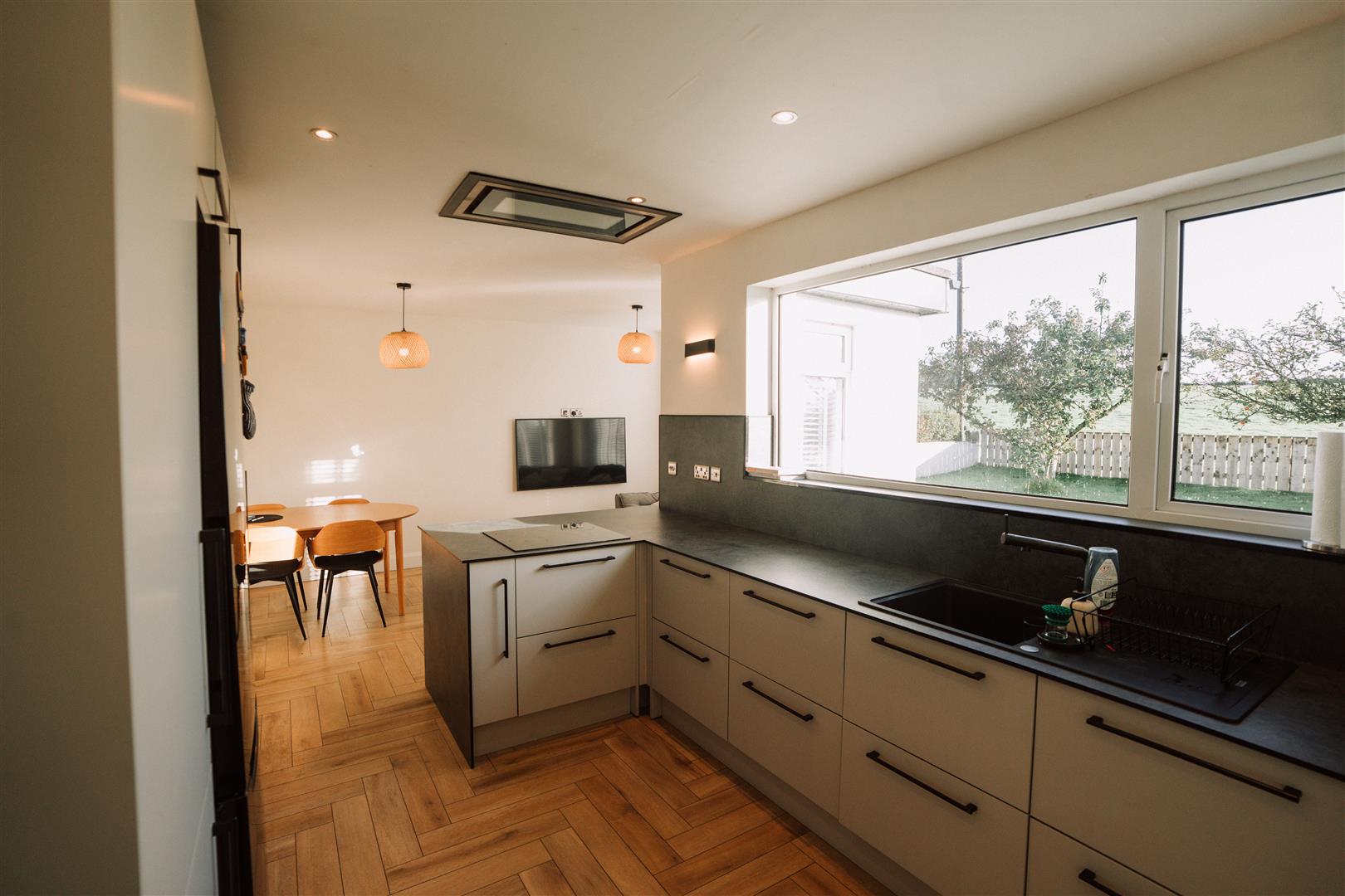 Range of luxury style matt units with contrasting black handles and slimline worktops. Composite sink and drainer with mixer tap. Overhead integrated extractor fan. Integrated eye-level double oven and microwave. Pull out full height panty. Ardour cupbaord with plugs for appliances. Integrated dishwasher. Herringbone flooring. Recessed spotlights. USB sockets. Oval vertical radiator.