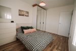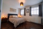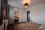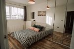 Built-in wardrobe. Wood effect herringbone laminate flooring.