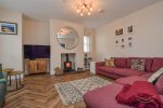 Feature wood burning stove with tiled hearth. Herringbone stone plastic composite flooring.