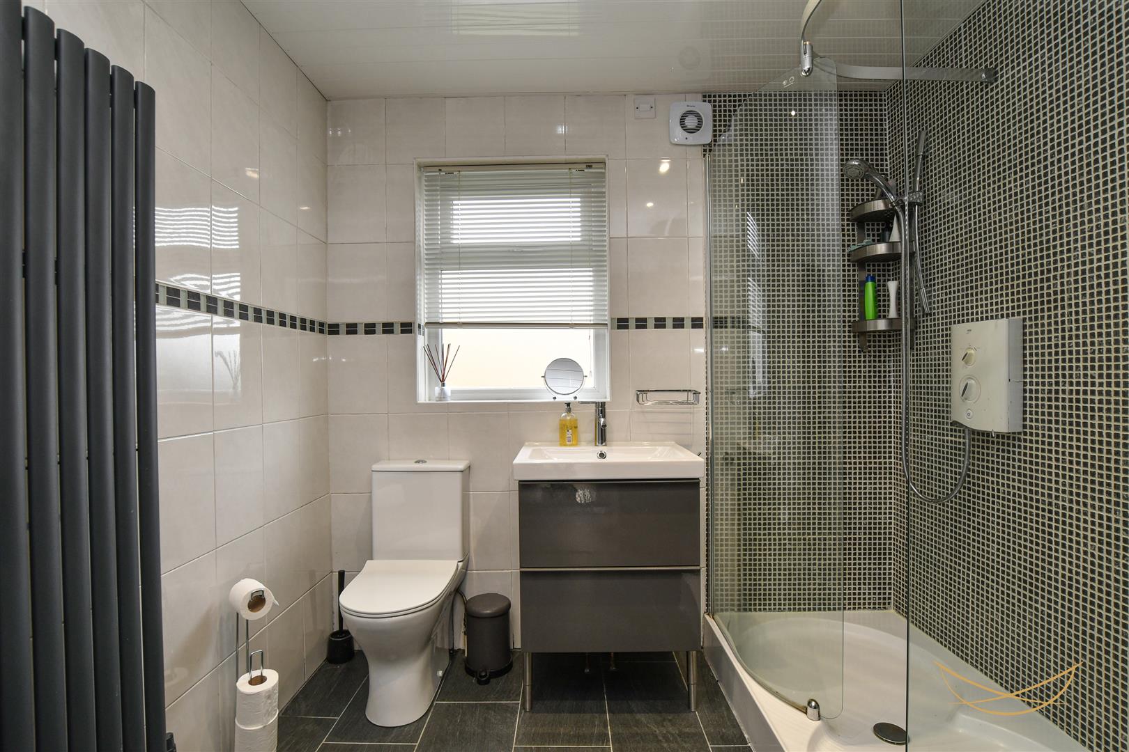 White suite comprising walk in shower unit. Low flush W/C. Vanity style sink unit with mixer taps. Feature vertical radiator. Tiled flooring. Tiled walls.