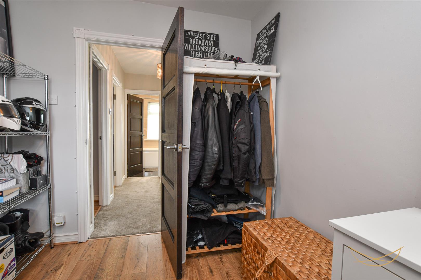 Laminate wood effect flooring. Access to storage.