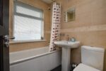 White suite comprising paneled bath with mixer taps and overhead shower. Low flush W/C. Pedestal wash hand basin with mixer taps. Fully tiled walls. Tiled flooring.