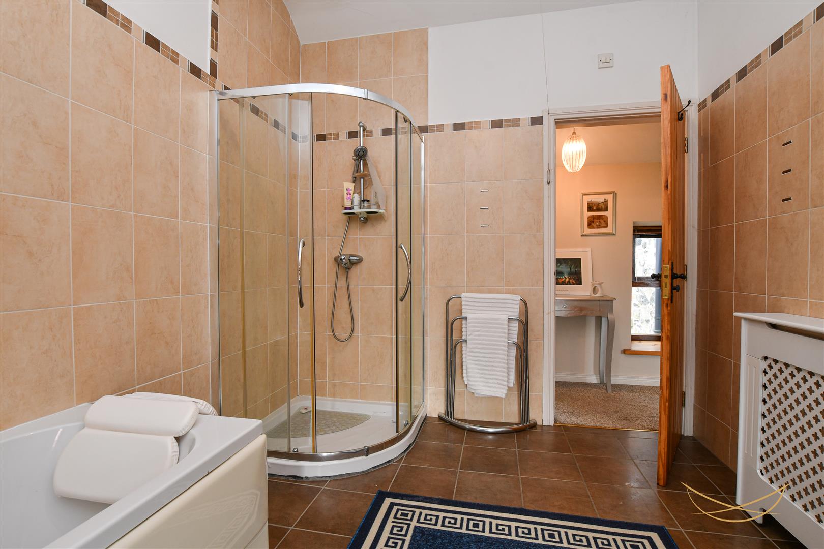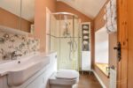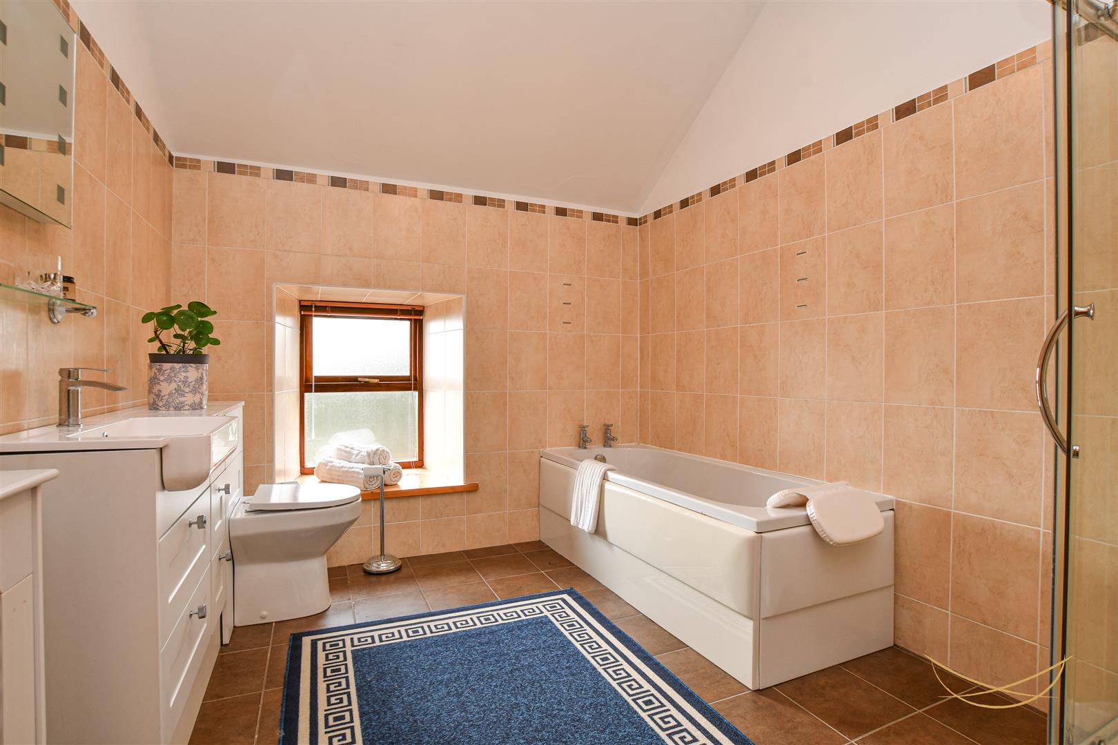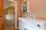 White suite comprising paneled bath with mixer taps. Fully enclosed corner mains shower. Vanity style sink unit with mixer taps and low flush W.C. Vaulted ceiling. Tiled flooring. Tiled walls.