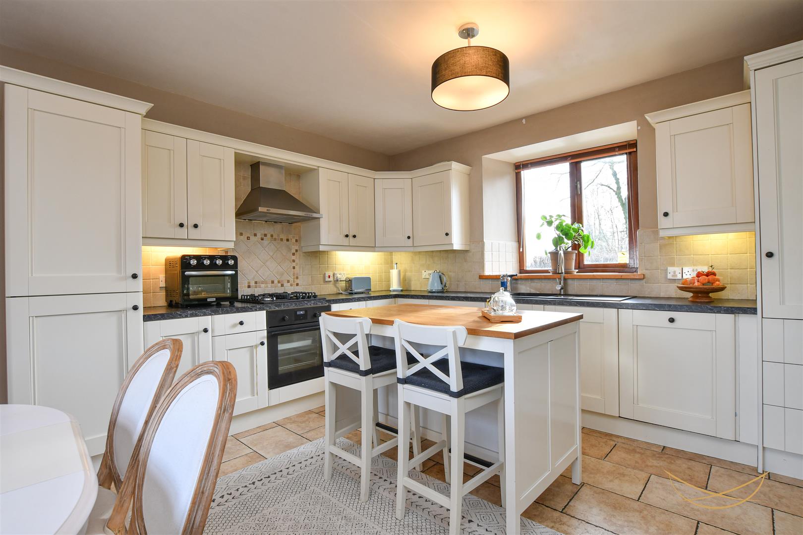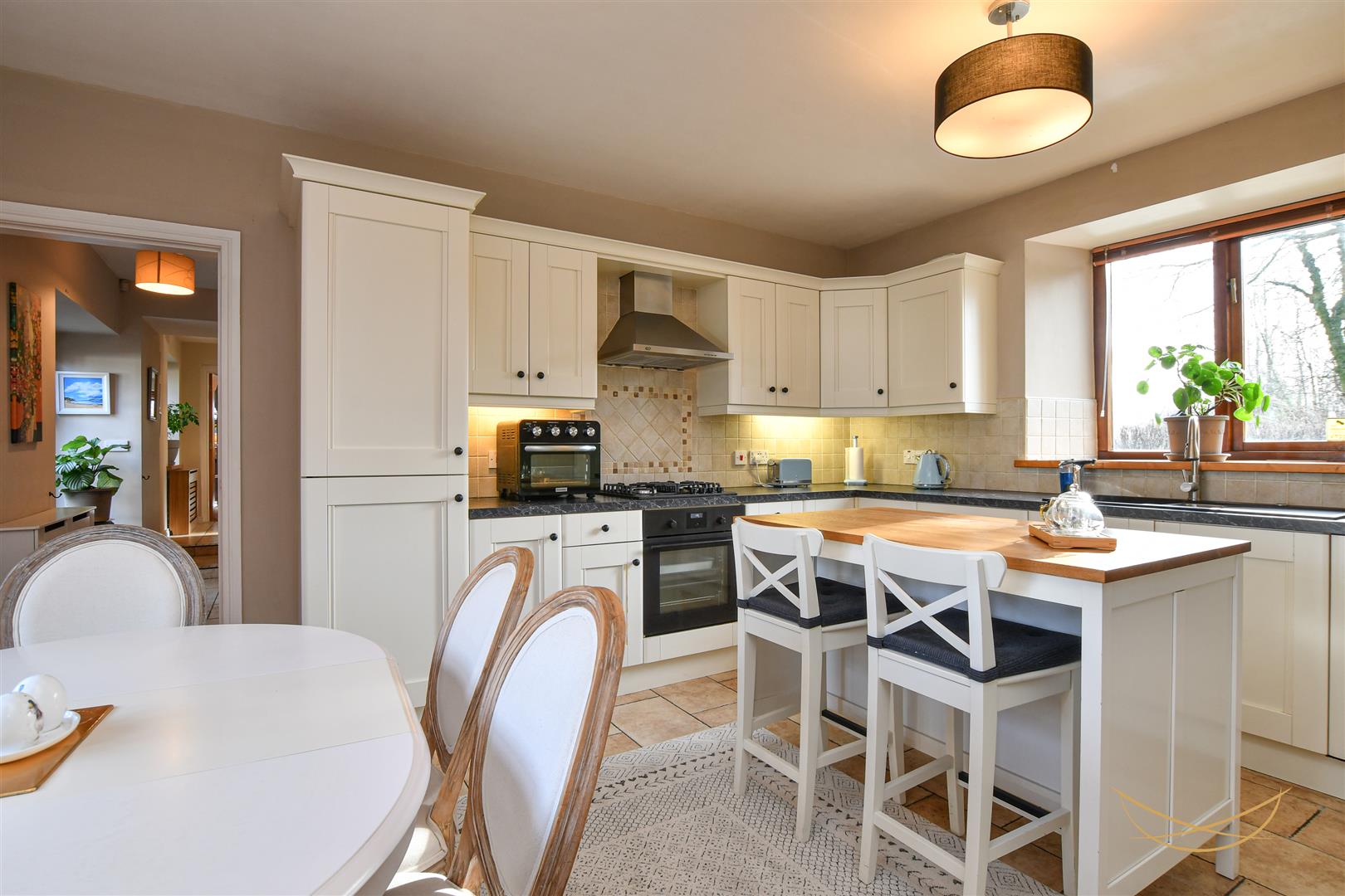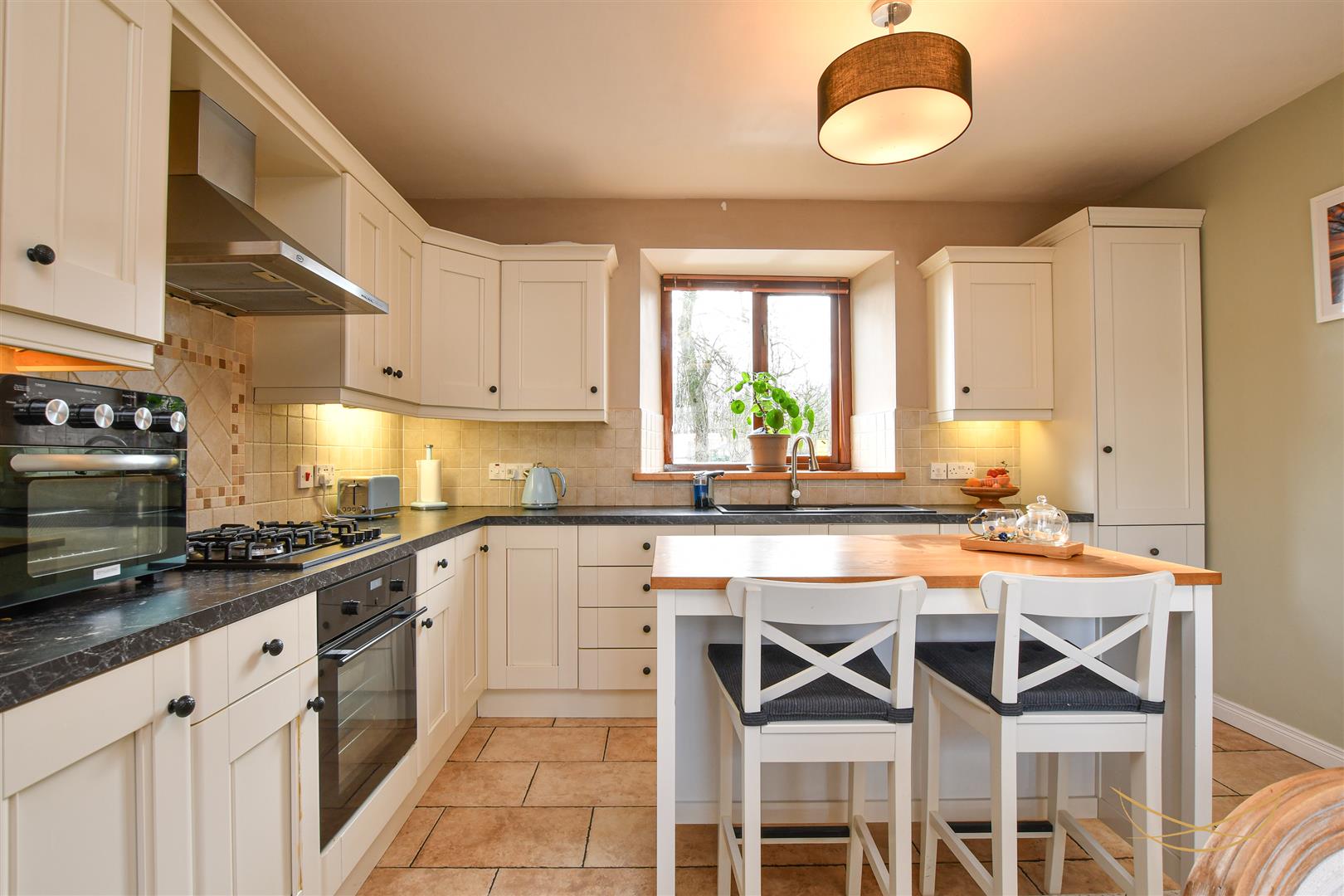 Hand painted kitchen with a range of high and low level units with contrasting formica worktops. 1.5 sink unit with drainer, mixer taps and food waste disposer. Integrated electric oven. Integrated gas hob. Integrated dishwasher. Pantry cupboard. Integrated fridge. Tiled splashback. Tiled flooring.