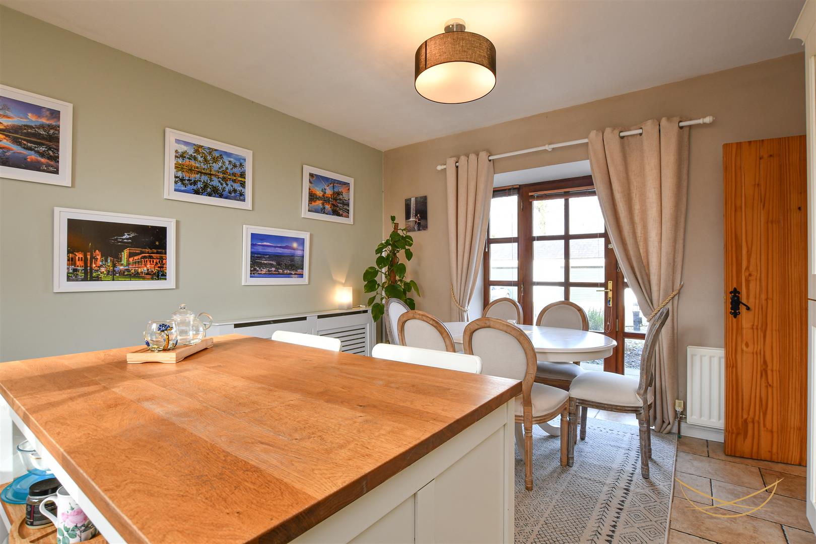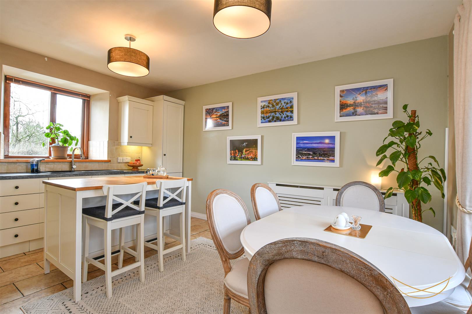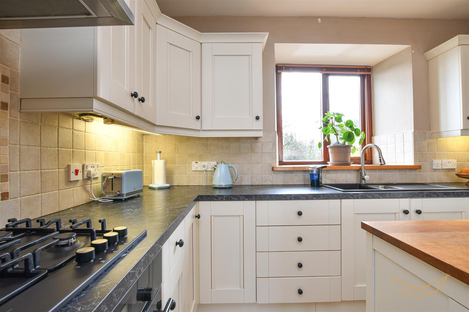 Hand painted kitchen with a range of high and low level units with contrasting formica worktops. 1.5 sink unit with drainer, mixer taps and food waste disposer. Integrated electric oven. Integrated gas hob. Integrated dishwasher. Pantry cupboard. Integrated fridge. Tiled splashback. Tiled flooring.