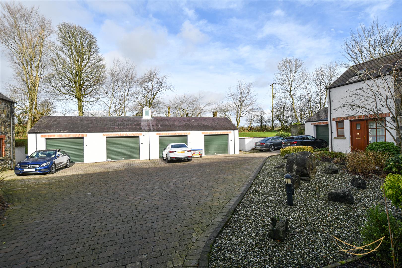 Externally, there is parking within the secure communal courtyard, along with a well-proportioned garage. The landscaped side and rear gardens are laid in lawns with paved patio areas, providing excellent outdoor space to enjoy the peaceful surroundings.