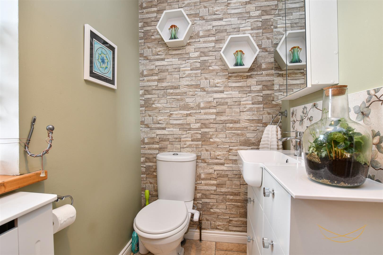 White suite comprising low flush W/C. Vanity style sink unit with mixer taps. Tiled flooring. Partially tiled walls.