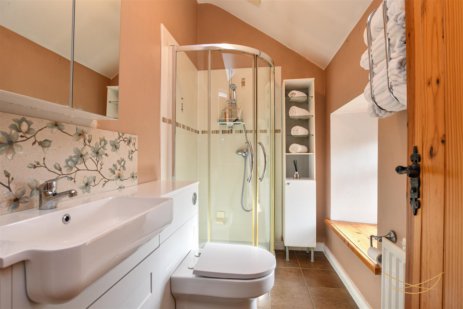 White suite comprising fully enclosed mains shower unit. Vanity style sink unit with mixer taps and low flush W/C. Tiled flooring. Partially tiled walls.