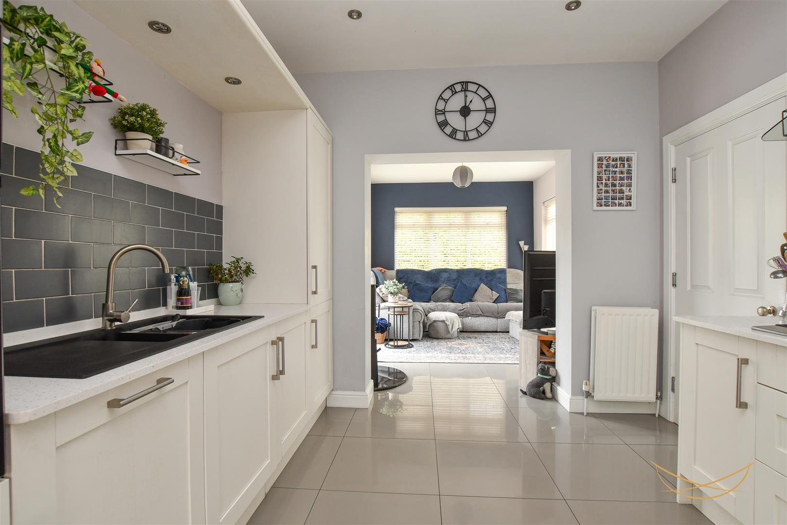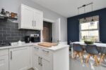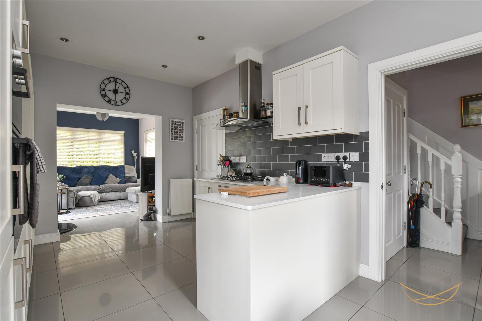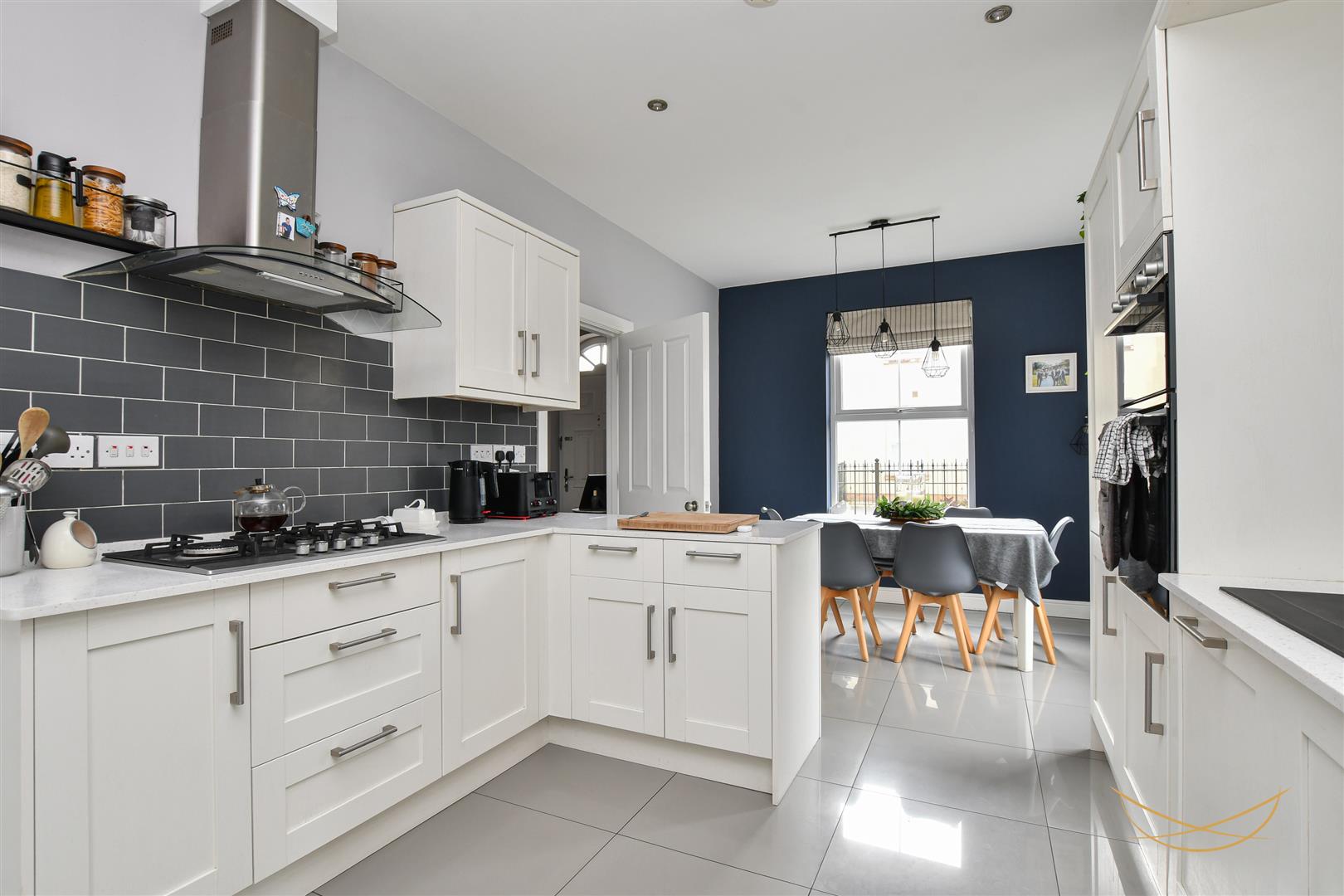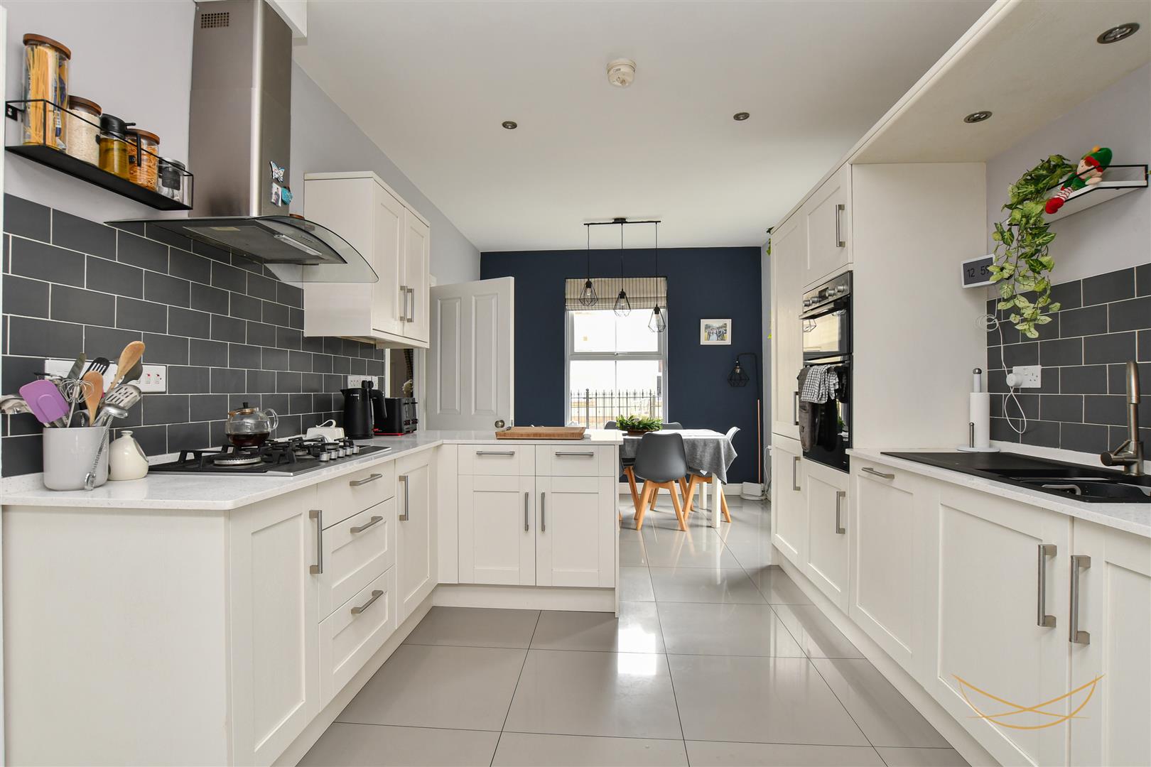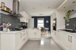 Range of high and low level units with quartz worktops. Composite 1.5 bowl sink unit with drainer and mixer taps. Integrated gas hob. Integrated extractor fan. Integrated Bosch oven and grill. Integrated fridge freezer. Integrated dishwasher. Tiled flooring. Tiled splashback. Recessed spotlights.