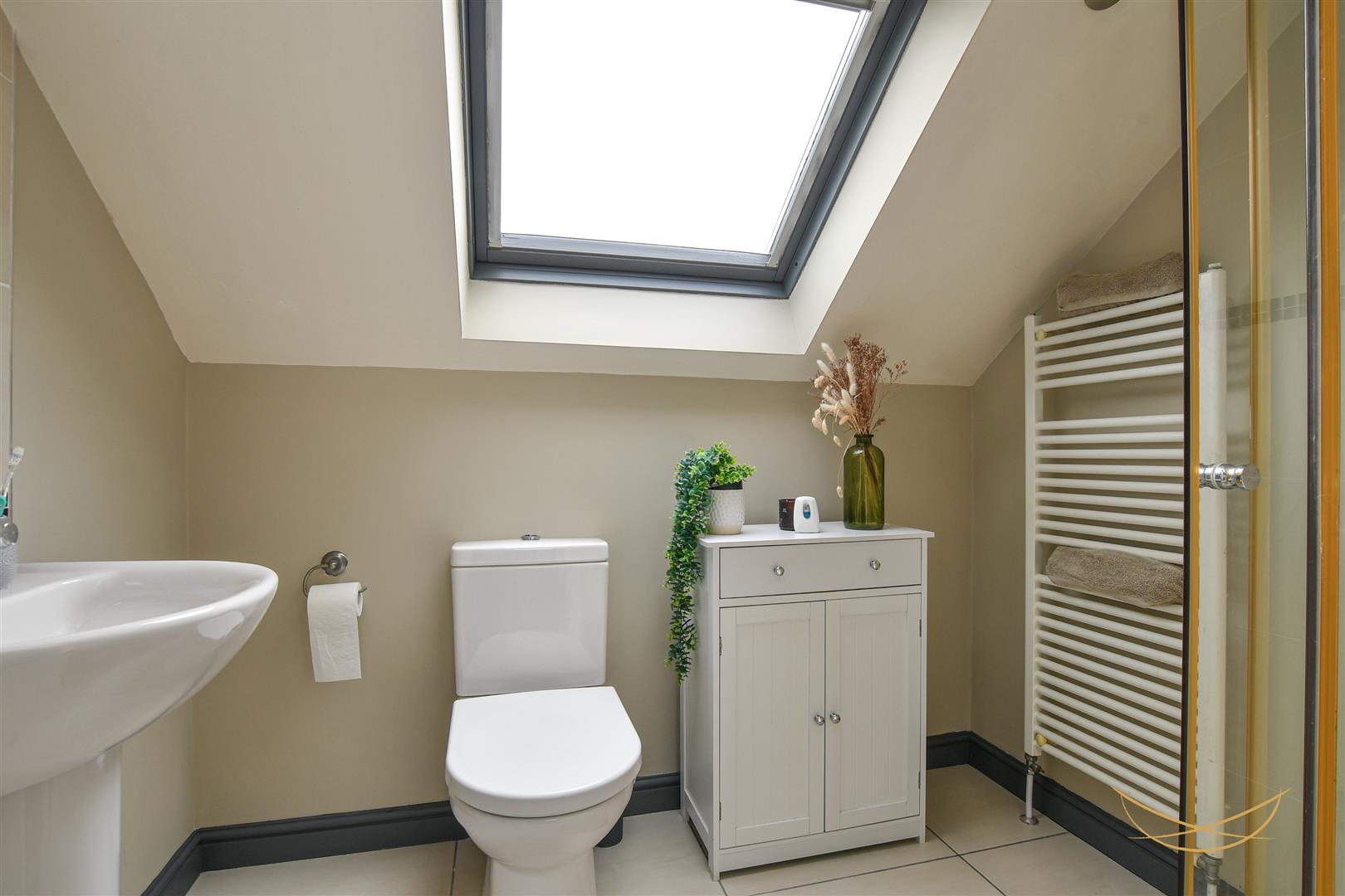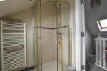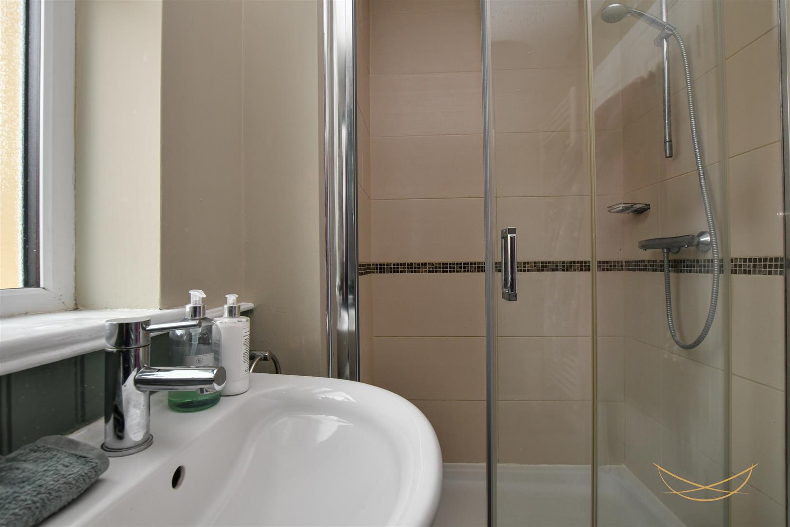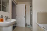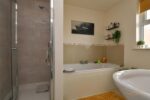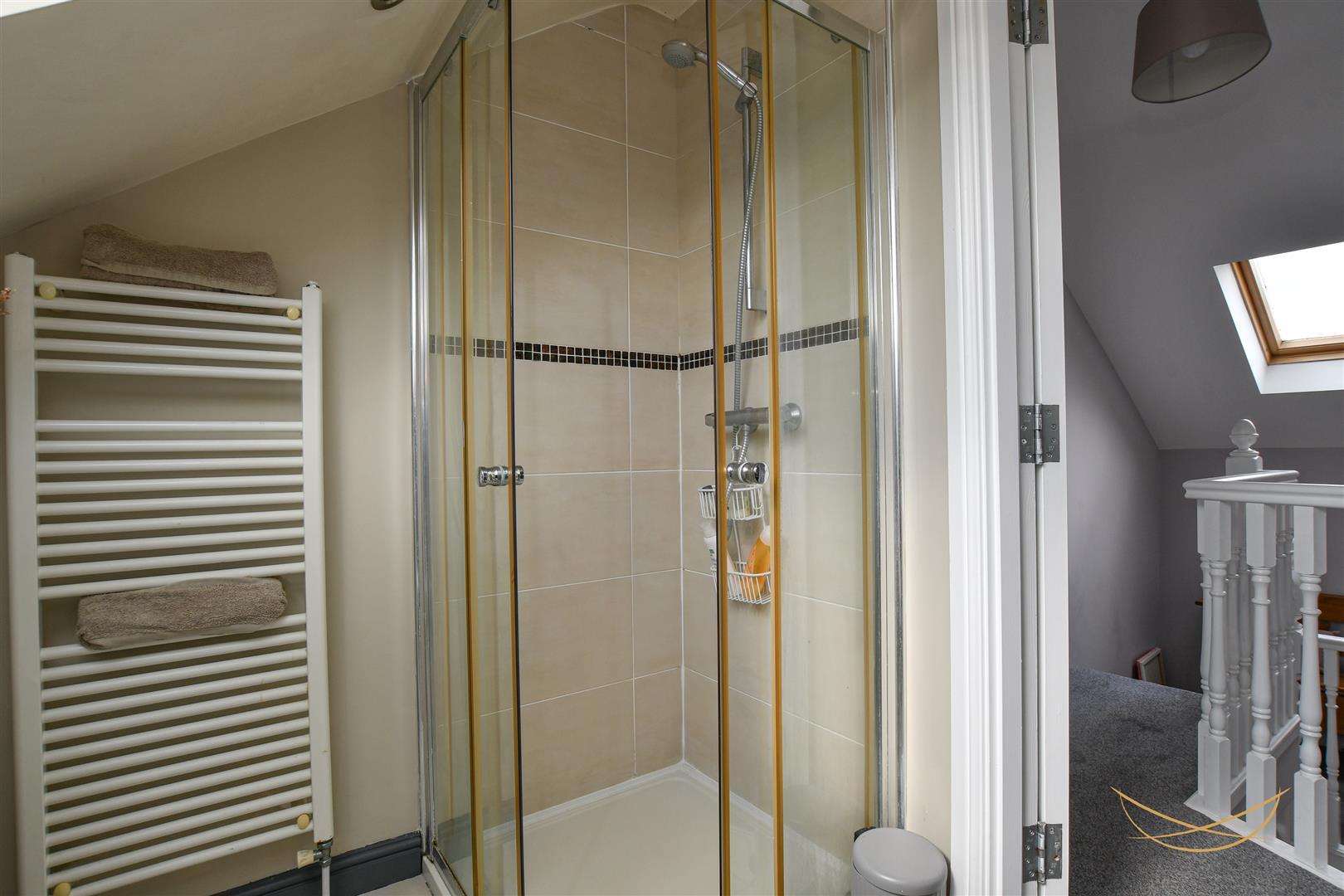 White suite comprising fully enclosed shower unit. Low flush W/C. Semi pedestal wash hand basin with mixer taps. Heated towel rail. Tiled flooring. Tiled walls.