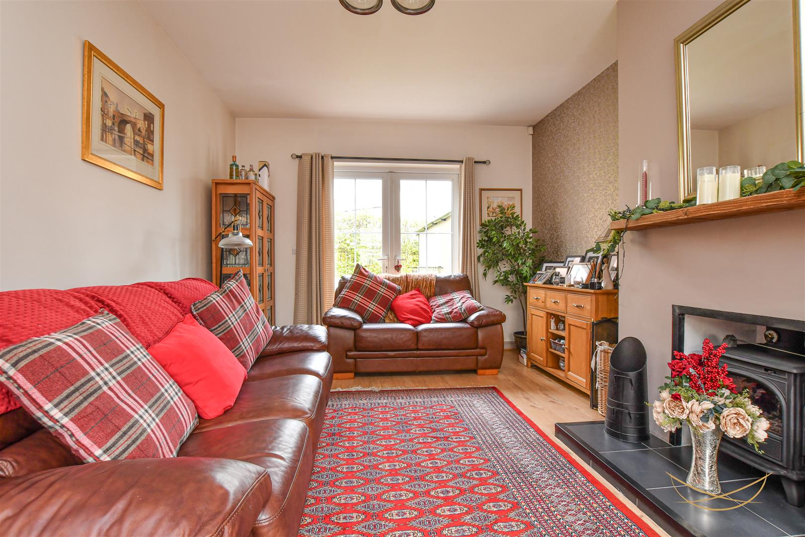 Feature multi fuel burning stove with tiled hearth and over beam mantle. Laminate wood effect flooring. Patio doors to rear garden.