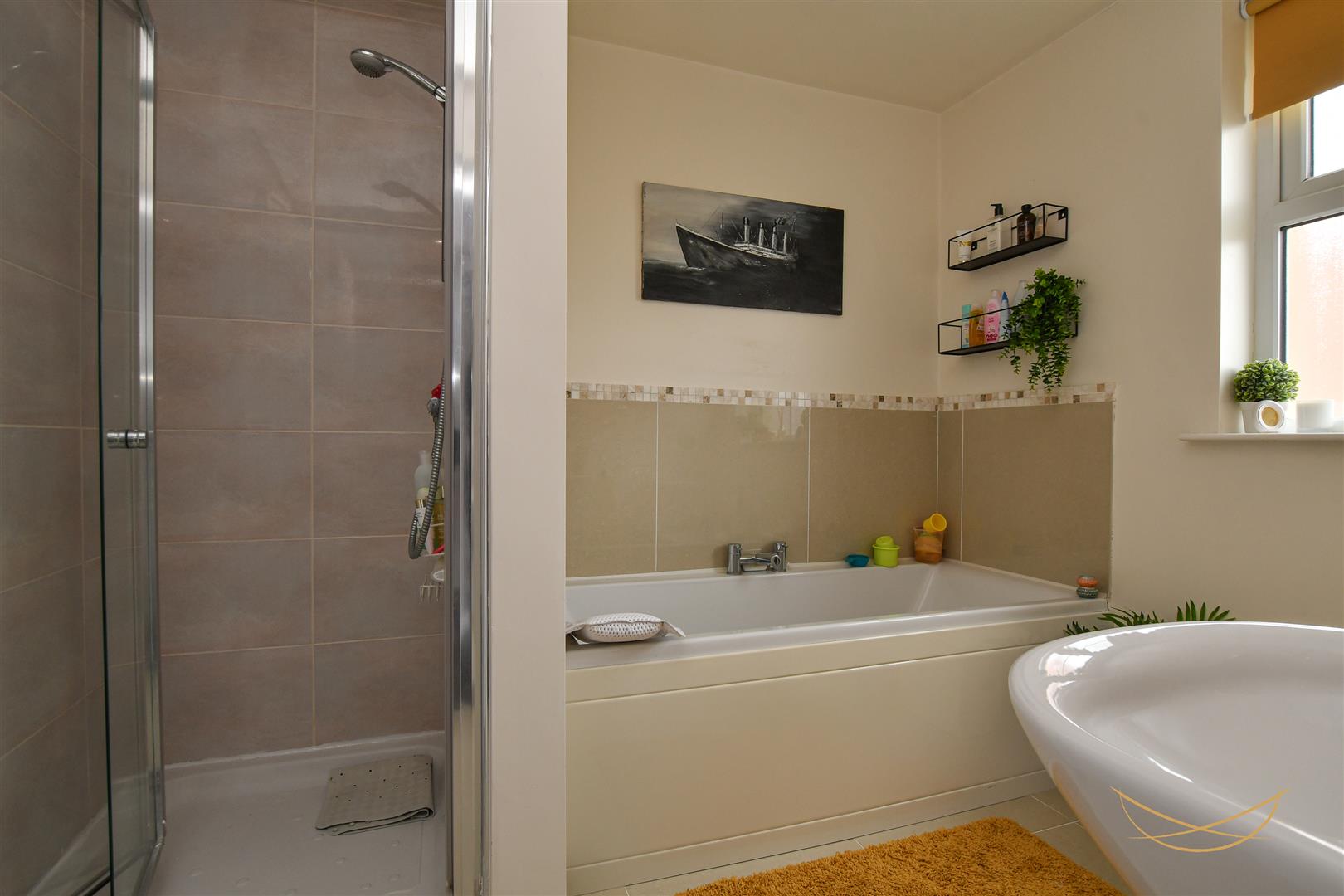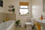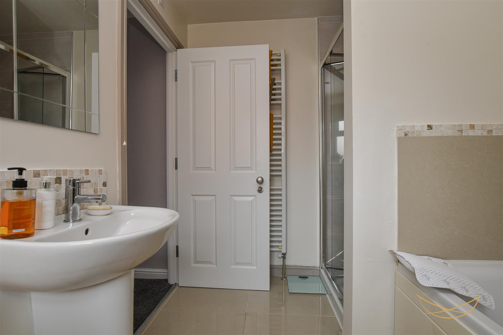White suite comprising paneled bath with mixer taps. Fully enclosed shower unit. Low flush W/C. Semi pedestal wash hand basin with mixer taps. Heated towel rail. Tiled splashback. Tiled flooring.