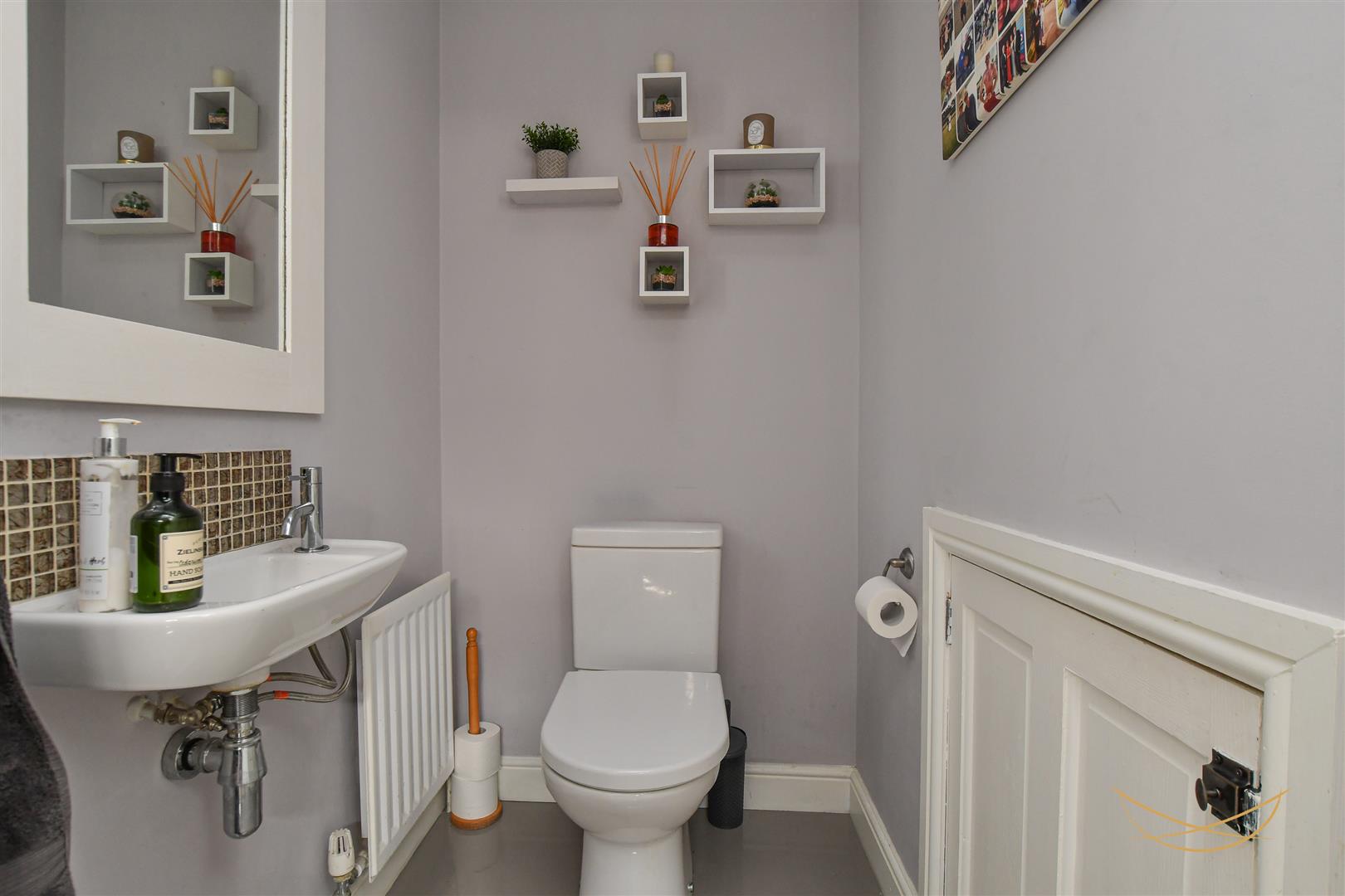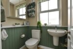 White suite comprising low flush W/C. Semi pedestal wash hand basin with mixer taps. Tiled splashback. Tiled flooring.