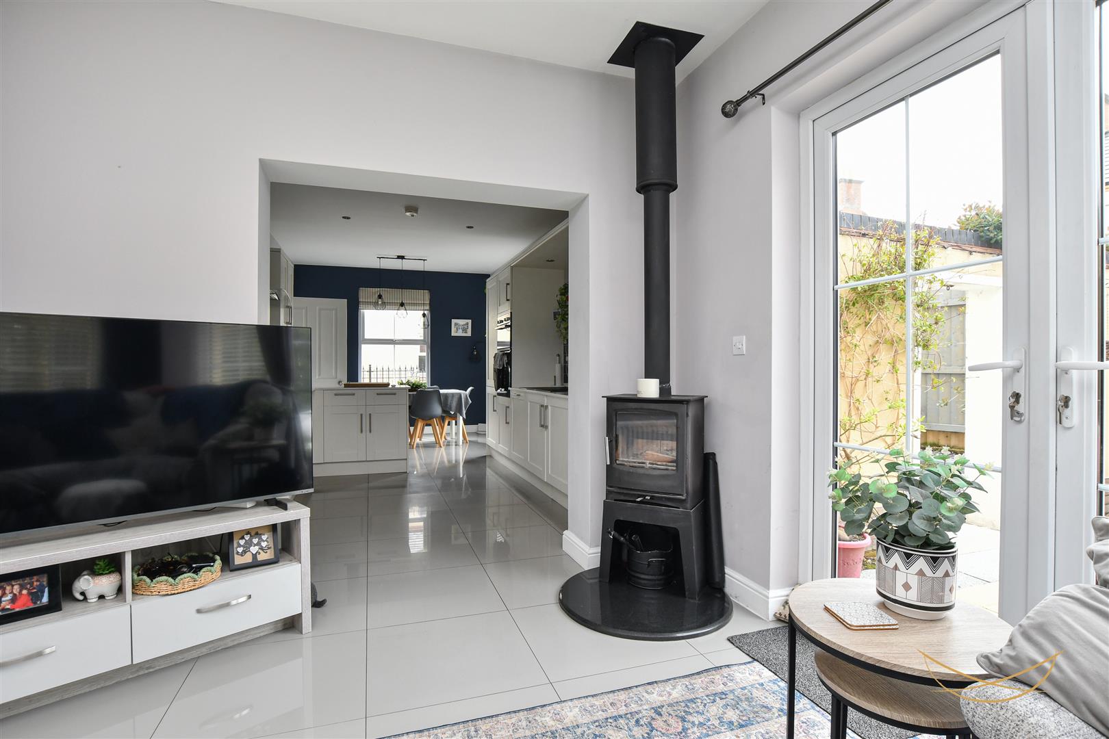 Multi fuel burning stove. Tiled flooring. Patio doors to rear garden.