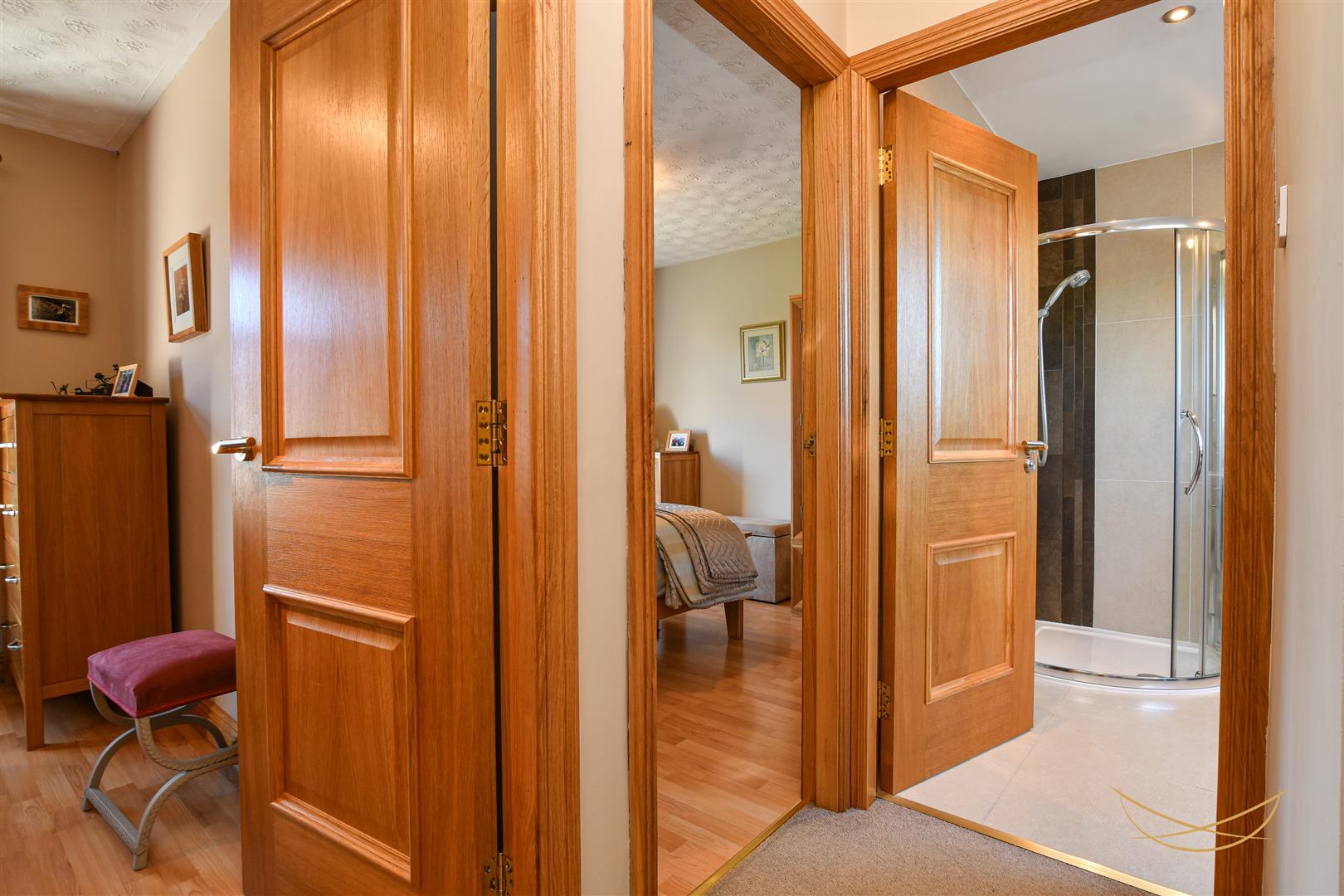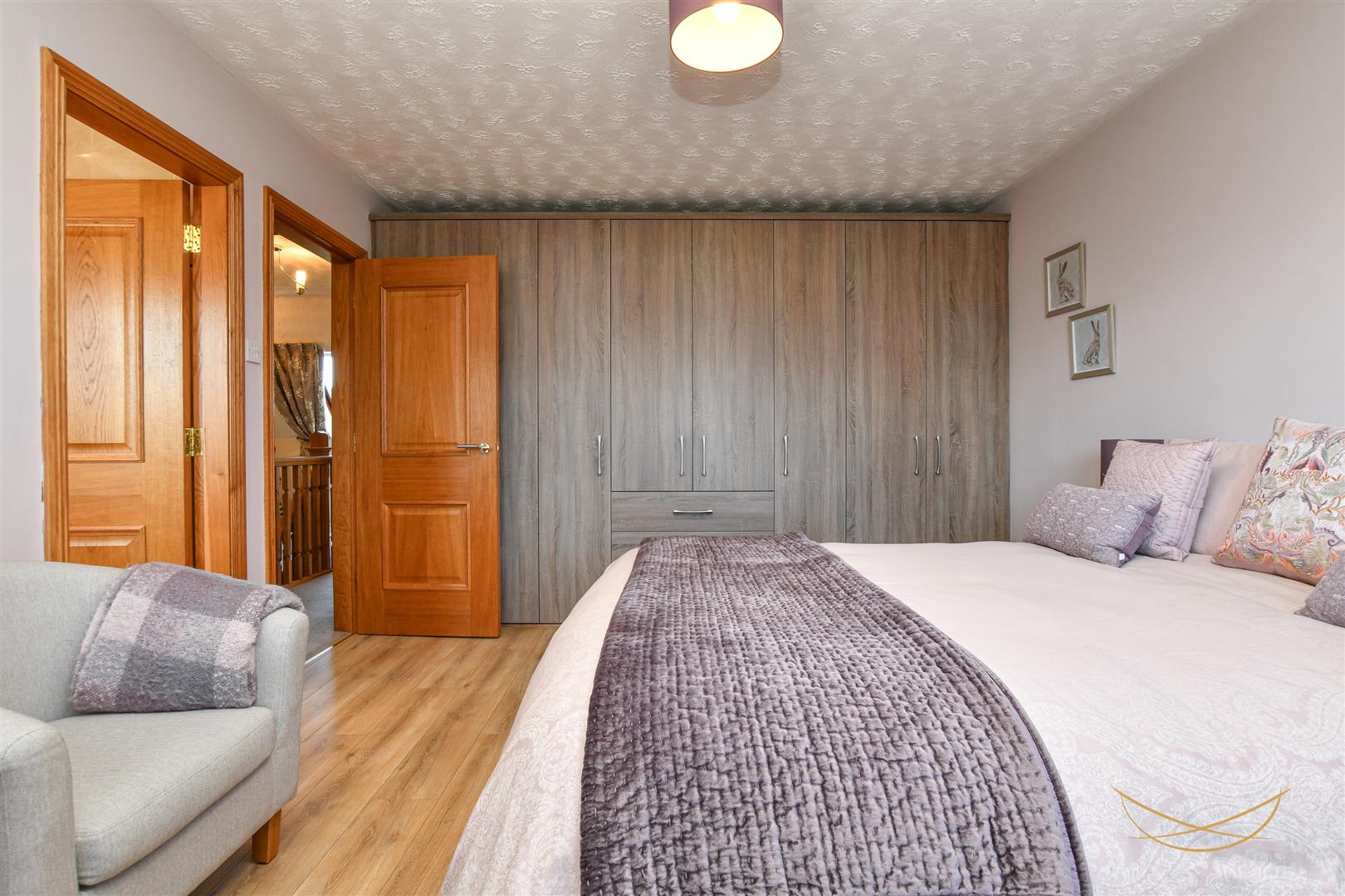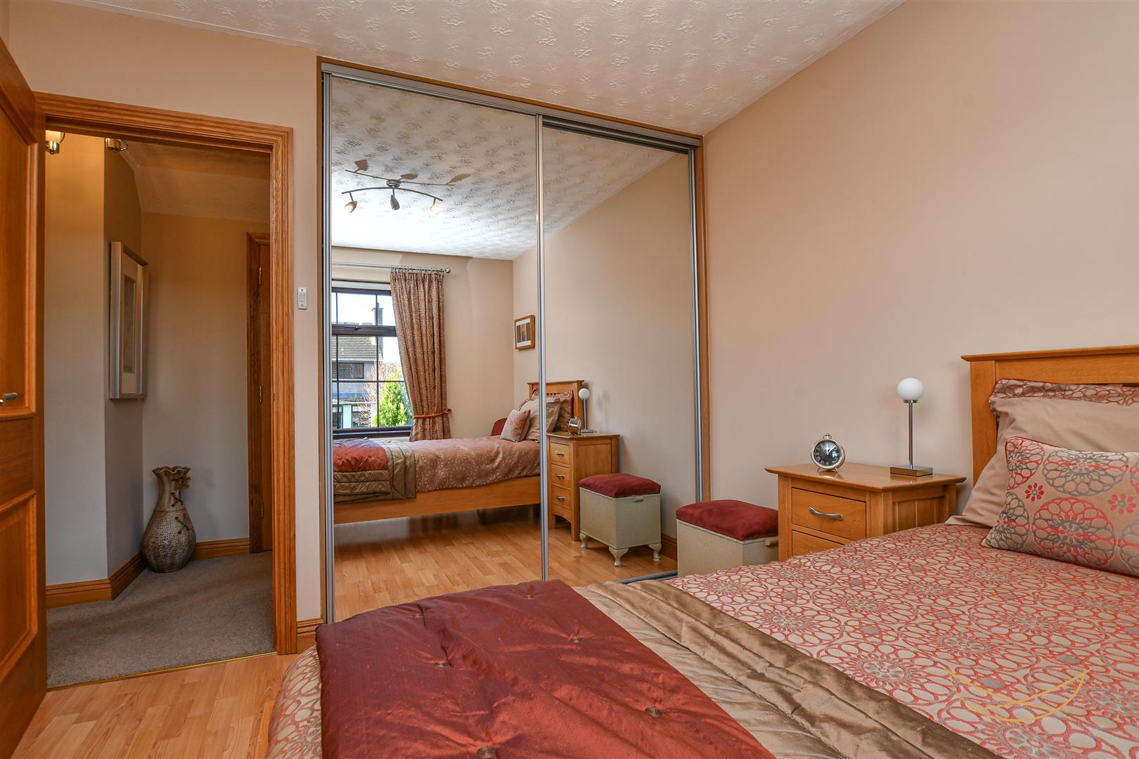 Laminate wood effect flooring. Built in sliderobes.