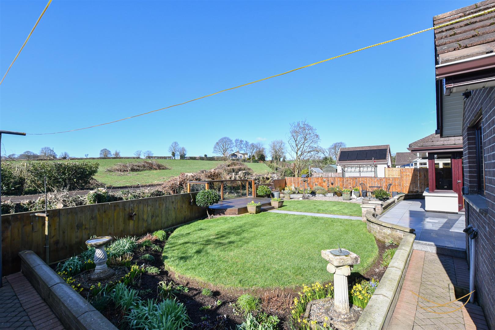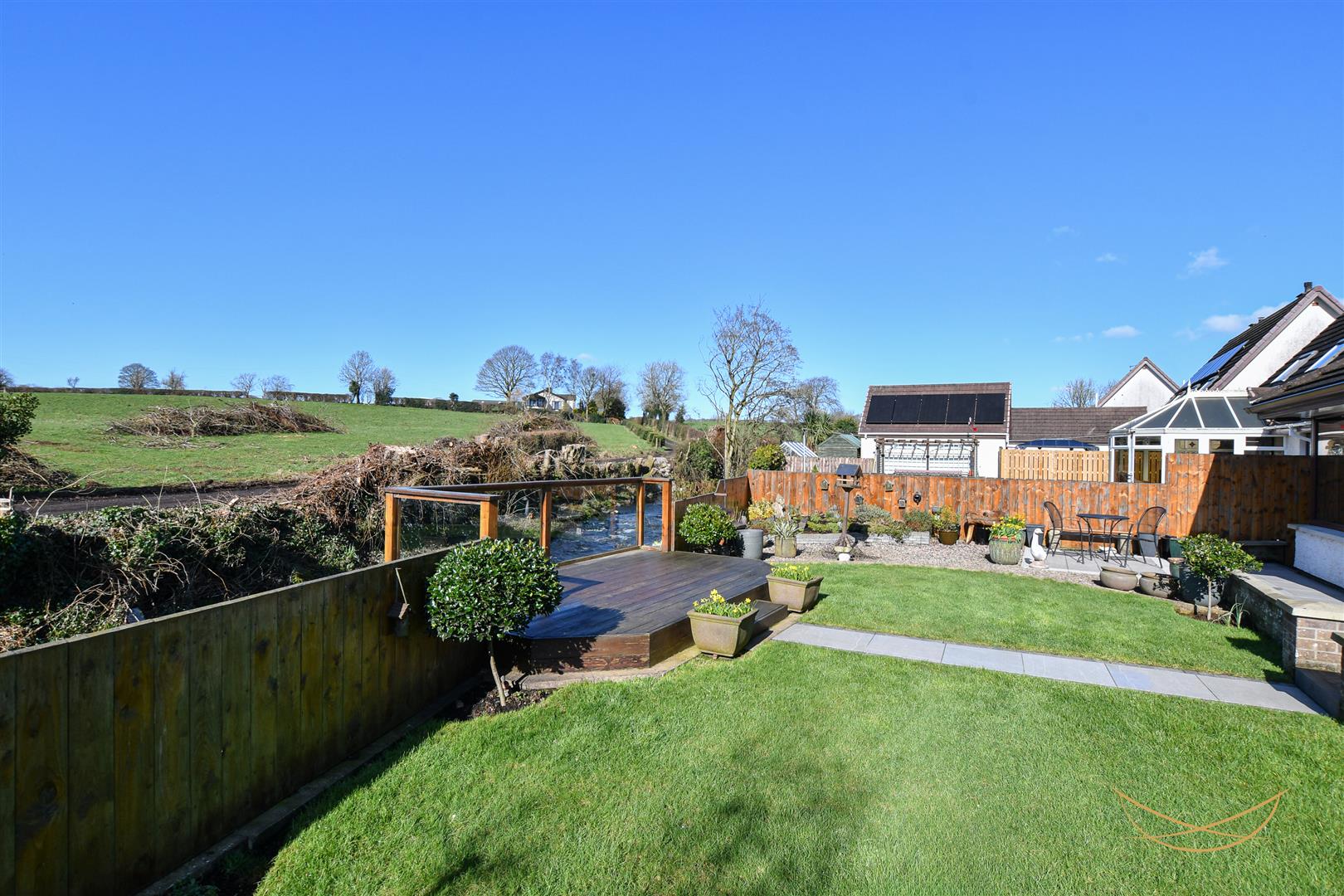 Rear enclosed garden with secure access to river. Laid in lawns bordered by flower beds and mature shrubbery. Raised decking overlooking the river. Feature Tobermore paving. Outdoor lighting. Outdoor tap.