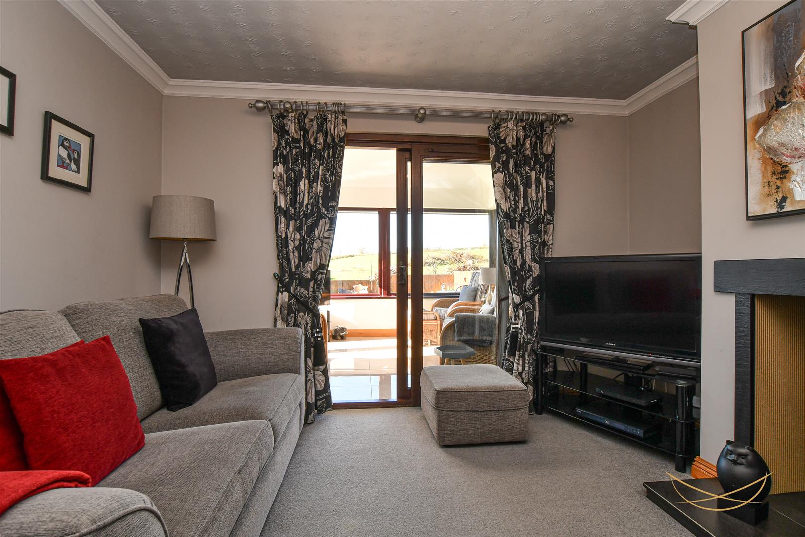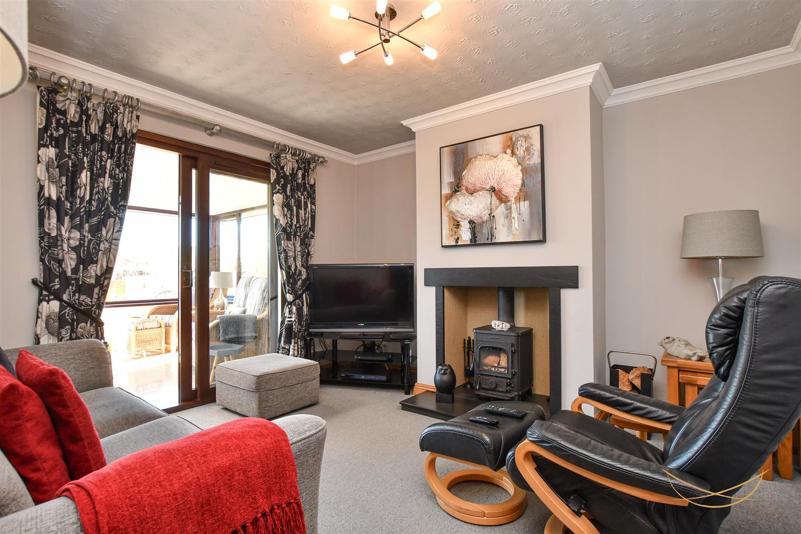 Feature multi fuel burning stove with tiled slate hearth. Sliding doors leading to conservatory. Cornice ceiling.