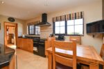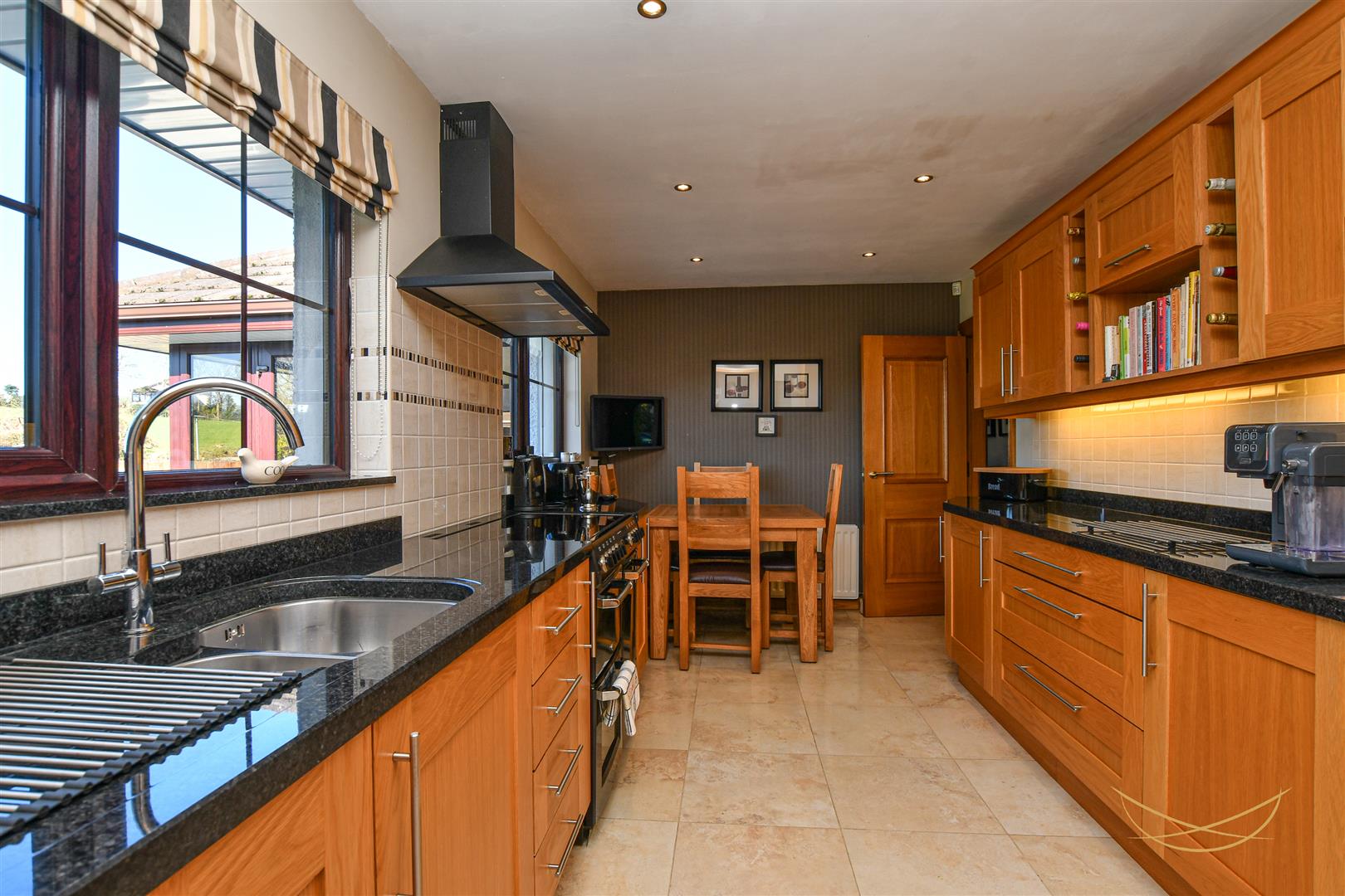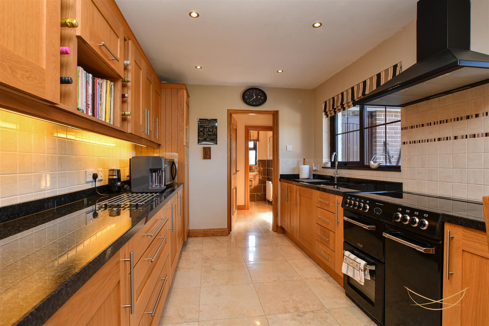 Range of high and low level units with contrasting marble worktops with matching upstand. 1.5 stainless steel sink unit with drainer and mixer taps. Under counter fridge. Pull out larder. Space for range master style cooker. Wine rack display. Tiled splashback. Tiled flooring. Recessed spotlights.