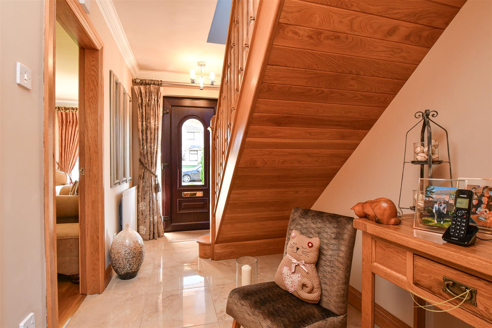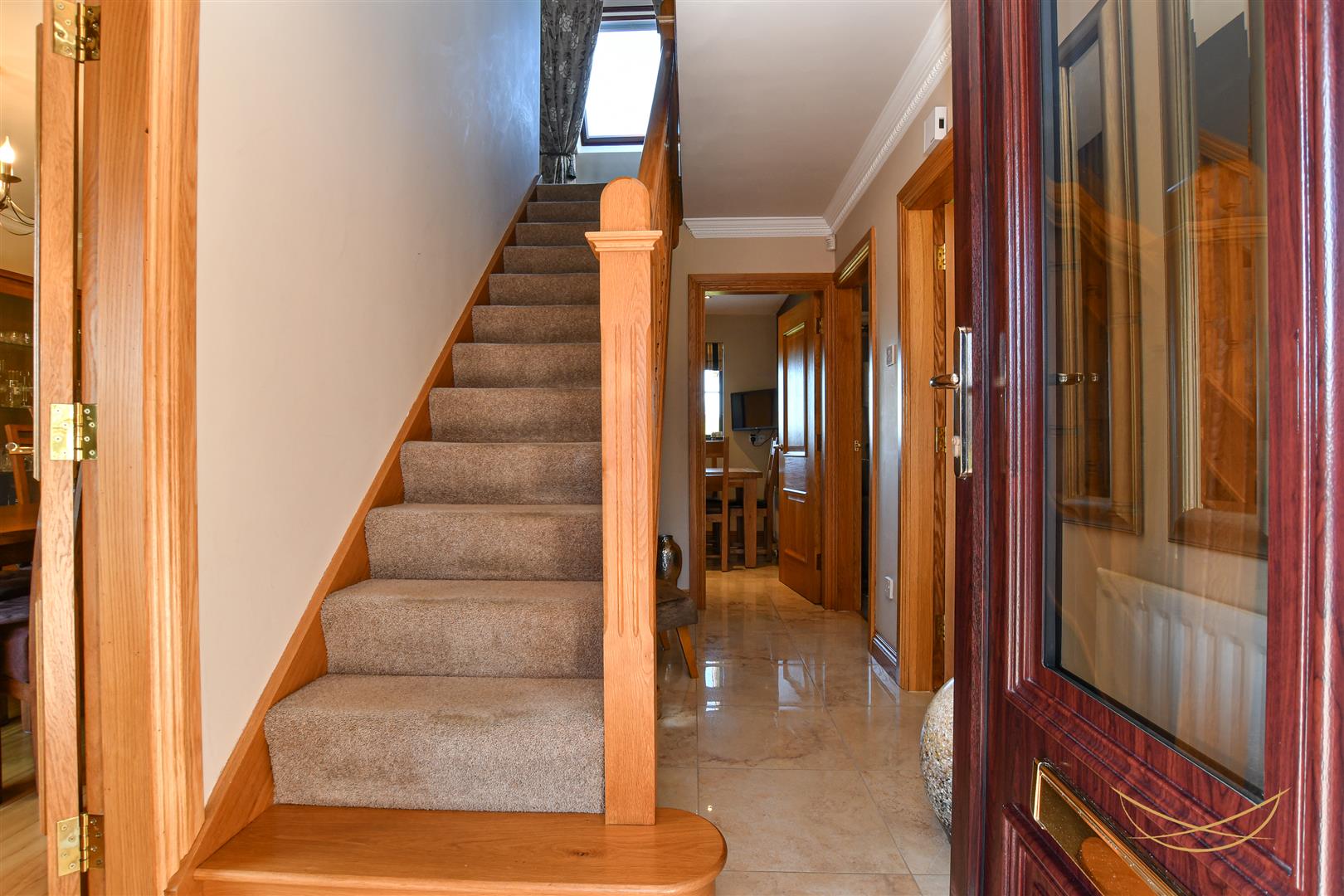 uPVC front door with glazed inset and glazed side panels. Ceramic tiled flooring. Cornice ceiling.