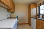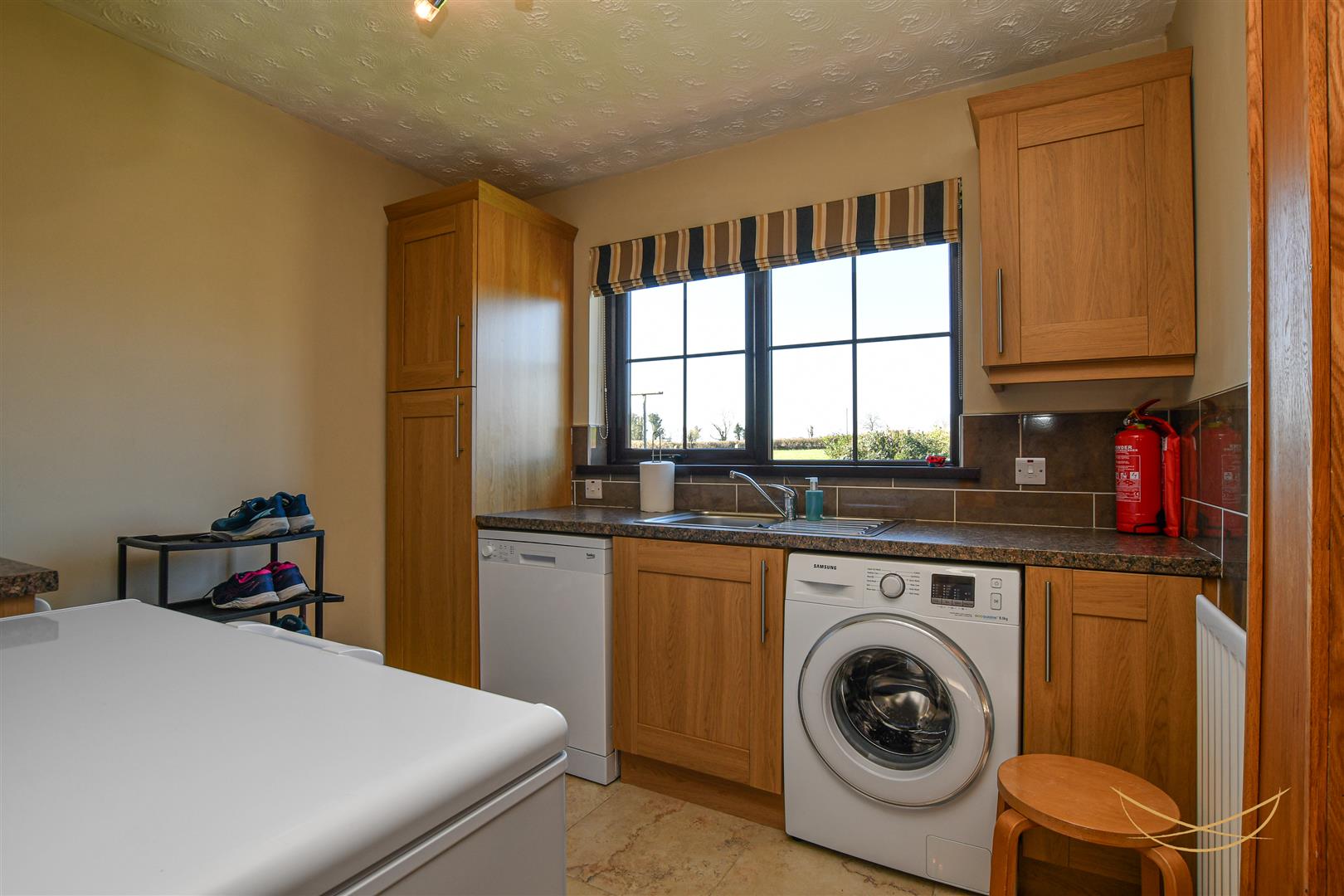 Range of high and low level units with contrasting formica worktops. Stainless steel sink unit with drainer and mixer taps. Space for dishwasher. Space for washing machine. Space for tumble dryer. Tiled splashback. Tiled flooring.