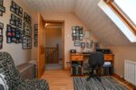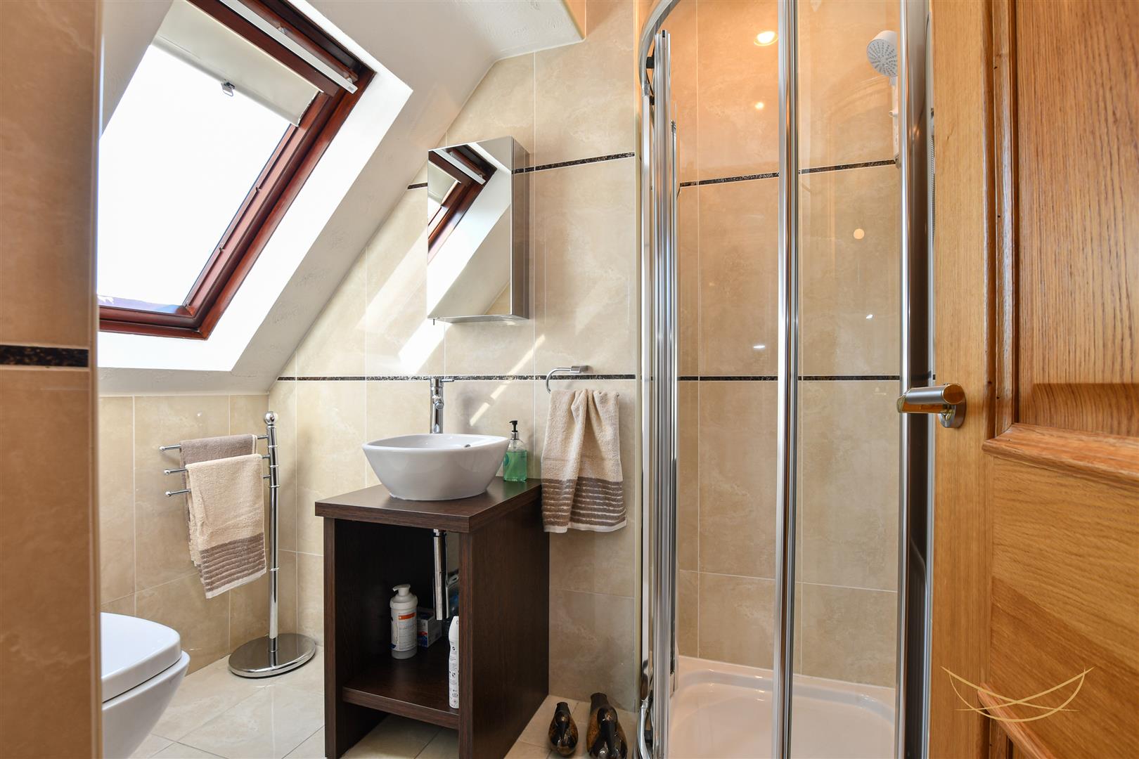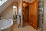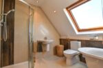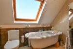 White four piece suite comprising free standing roll top bath with mixer taps. Fully enclosed mains shower. Semi pedestal wash hand basin with mixer taps. Low flush W/C. Heated chrome towel rail. Tiled flooring. Tiled walls. Recessed spotlights. Velux window. Extractor fan.