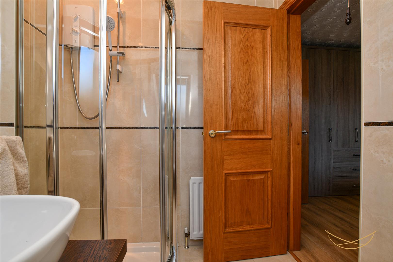 White suite comprising fully enclosed Mira sport shower. Sink unit with mixer taps. Low flush W/C. Tiled flooring. Tiled splasback. Recessed spotlights. Extractor fan.