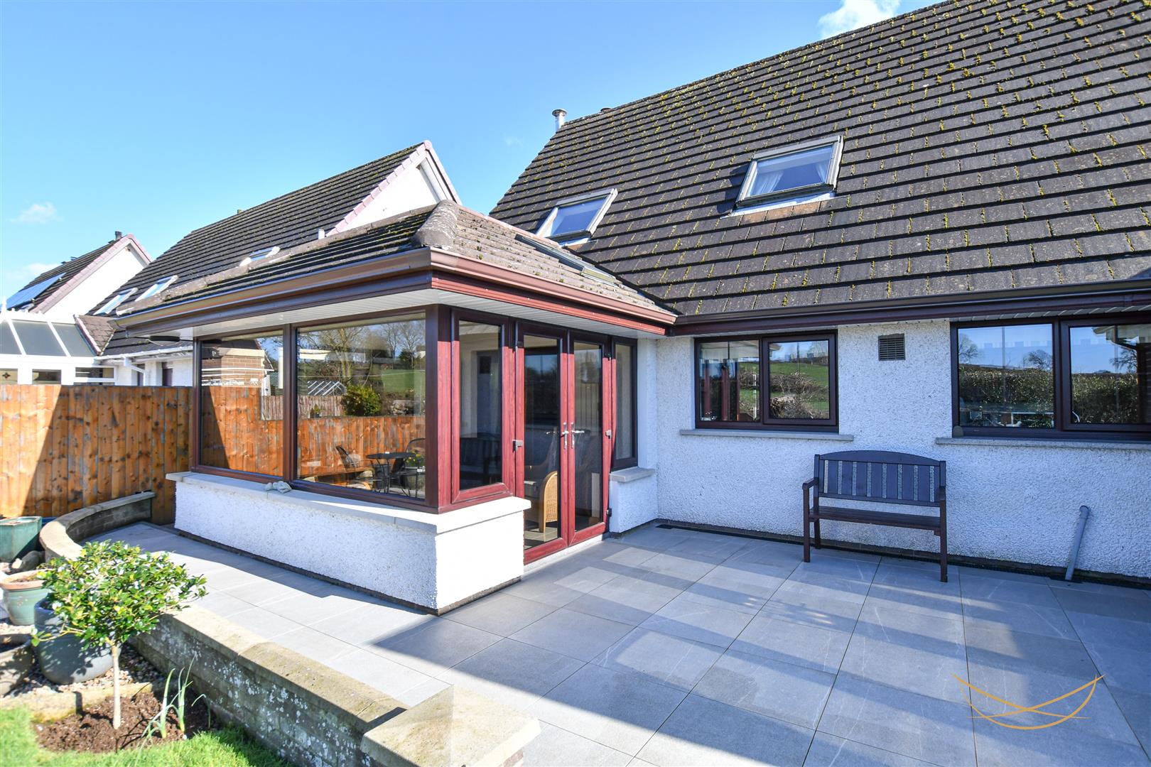 Feature vaulted ceiling with two Velux windows. Ceramic tiled flooring. Vertical radiators. Double patio doors leading to porcelain tiles patio and rear garden.