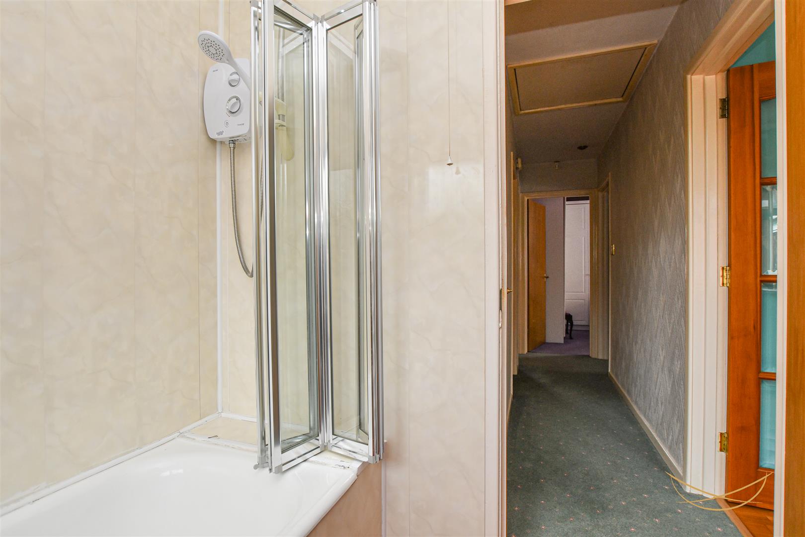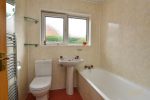 White suite comprising paneled bath with mixer taps and overhead electric shower. Low flush W.C. Pedestal wash hand basin with mixer taps. Heated chrome towel rail.