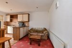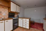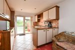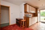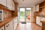 Range of high and low level units with contrasting wood worktops. Stainless steel sink unit with drainer and mixer taps. Space for oven/hob. Space for fridge freezer. Feature display cabinets. Tiled splashback. Tiled flooring. Access to rear garden. Recessed spotlights.