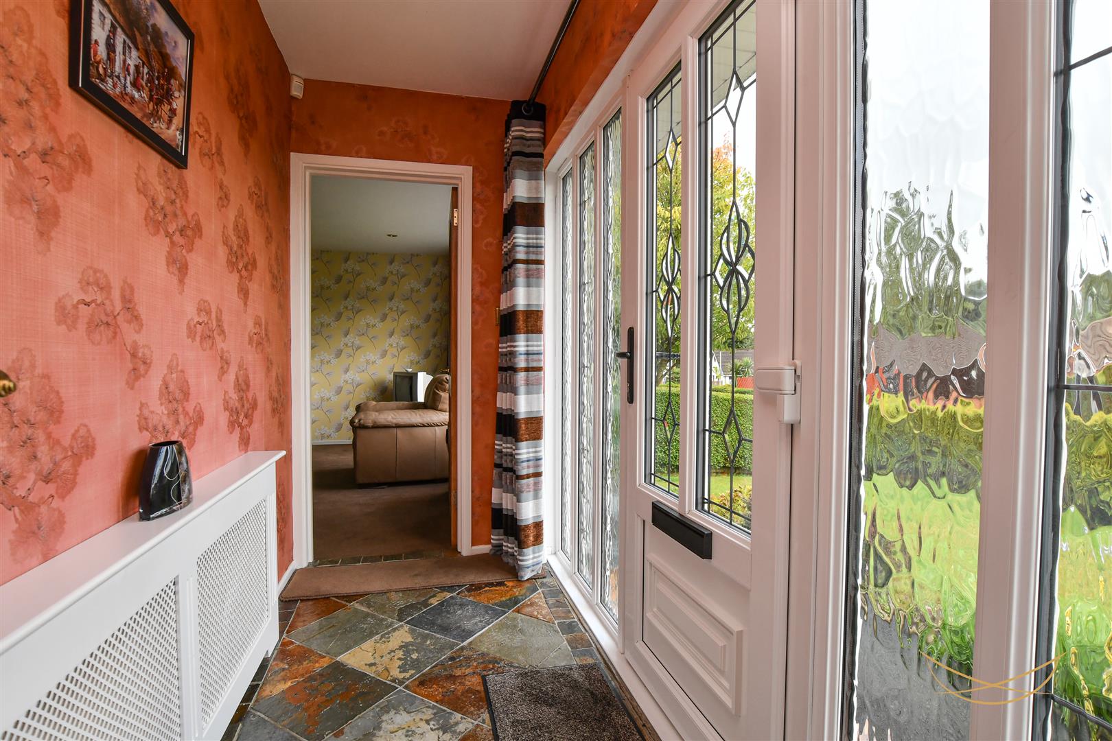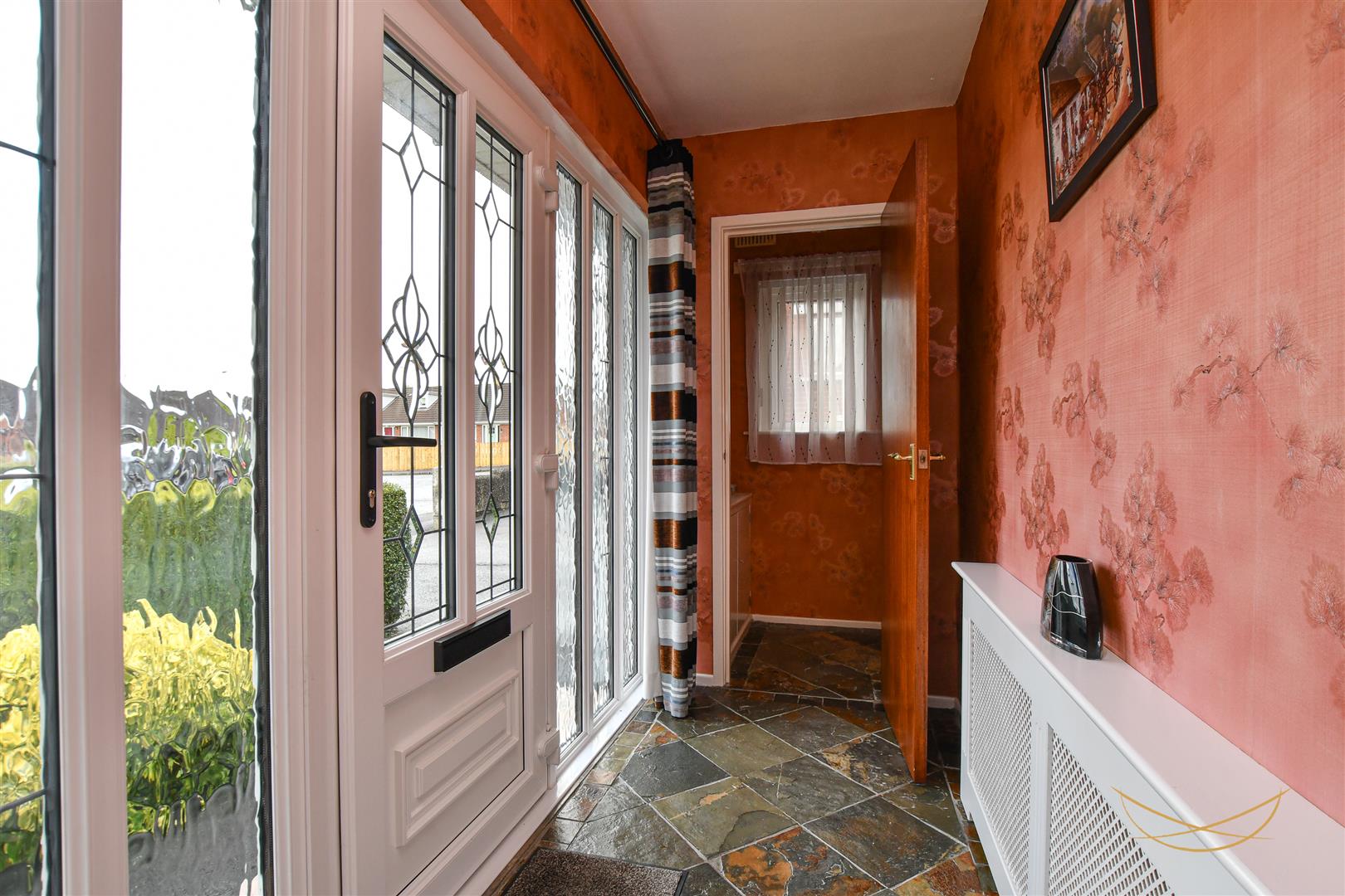 uPVC front door with feature glazed side panels and insets. Tiled flooring. Access to storage.