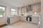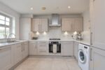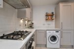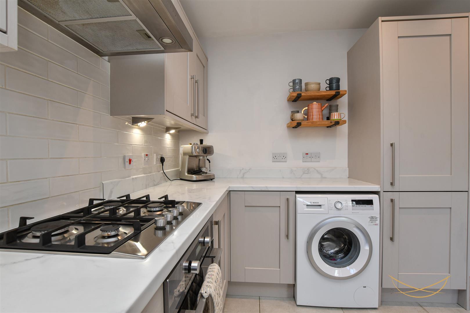 Shaker style kitchen with a range of high and low level units and contrasting formica worktops. Integrated electric oven and hob. Integrated stainless steel extractor fan. Stainless steel 1.5 sink bowl unit with drainer and mixer taps. Integrated fridge freezer. Integrated dishwasher. Integrated tumble dryer. Tiled flooring. Tiled splashback. Recessed spotlights. Access to rear garden.