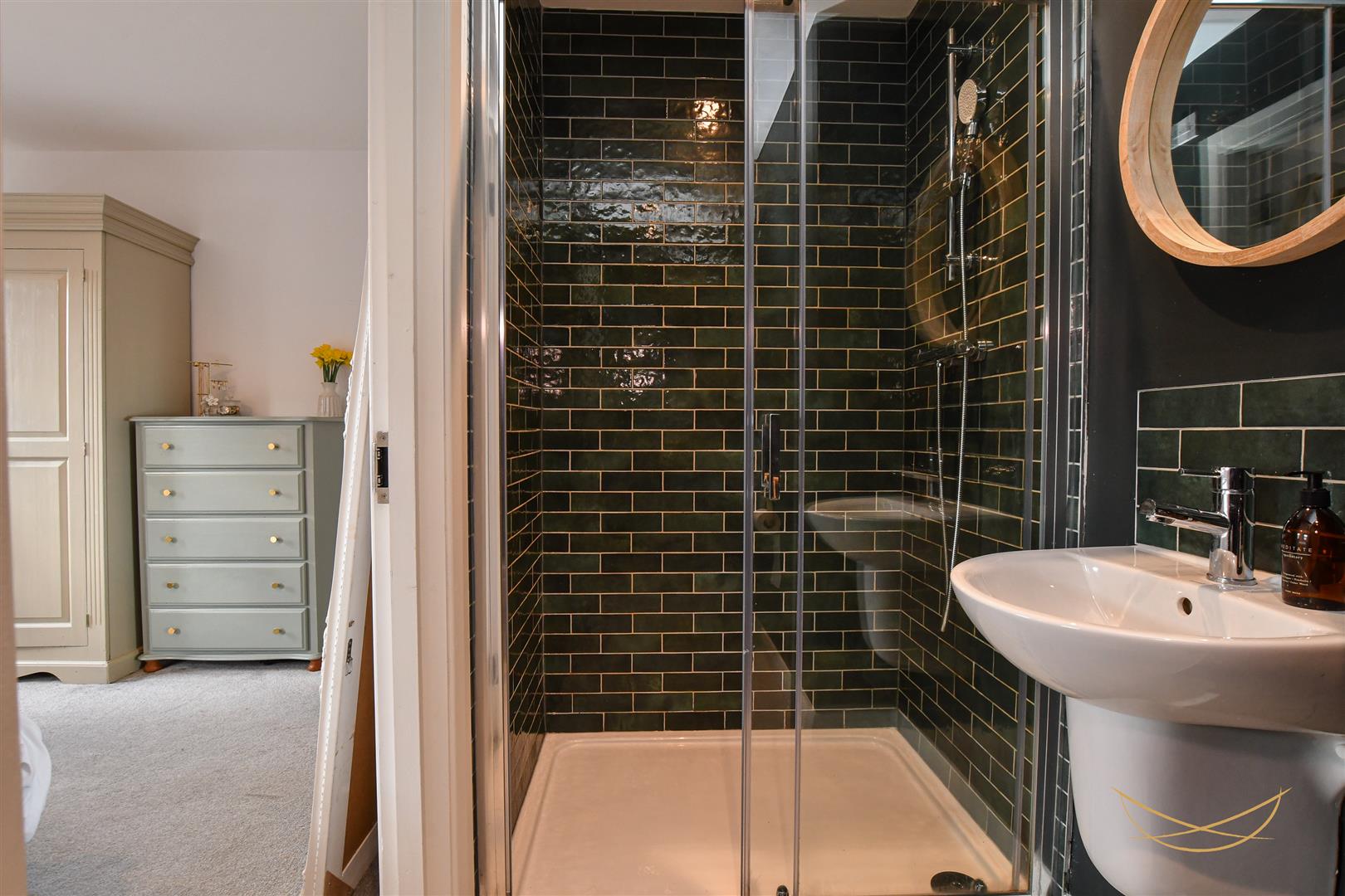 White suite comprising fully enclosed mains shower unit. Low flush W/C. Semi pedestal wash hand basin with mixer taps. Partially tiled walls. Tiled flooring.