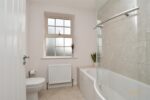 White suite comprising low flush W/C. Semi pedestal wash hand basin with mixer taps. Tiled flooring. Tiled splashback.