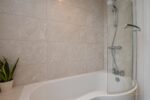 White suite comprising paneled bath with mixer taps and overhead shower. Low flush W/C. Semi pedestal wash hand basin with mixer taps. Partially tiled walls. Tiled flooring.