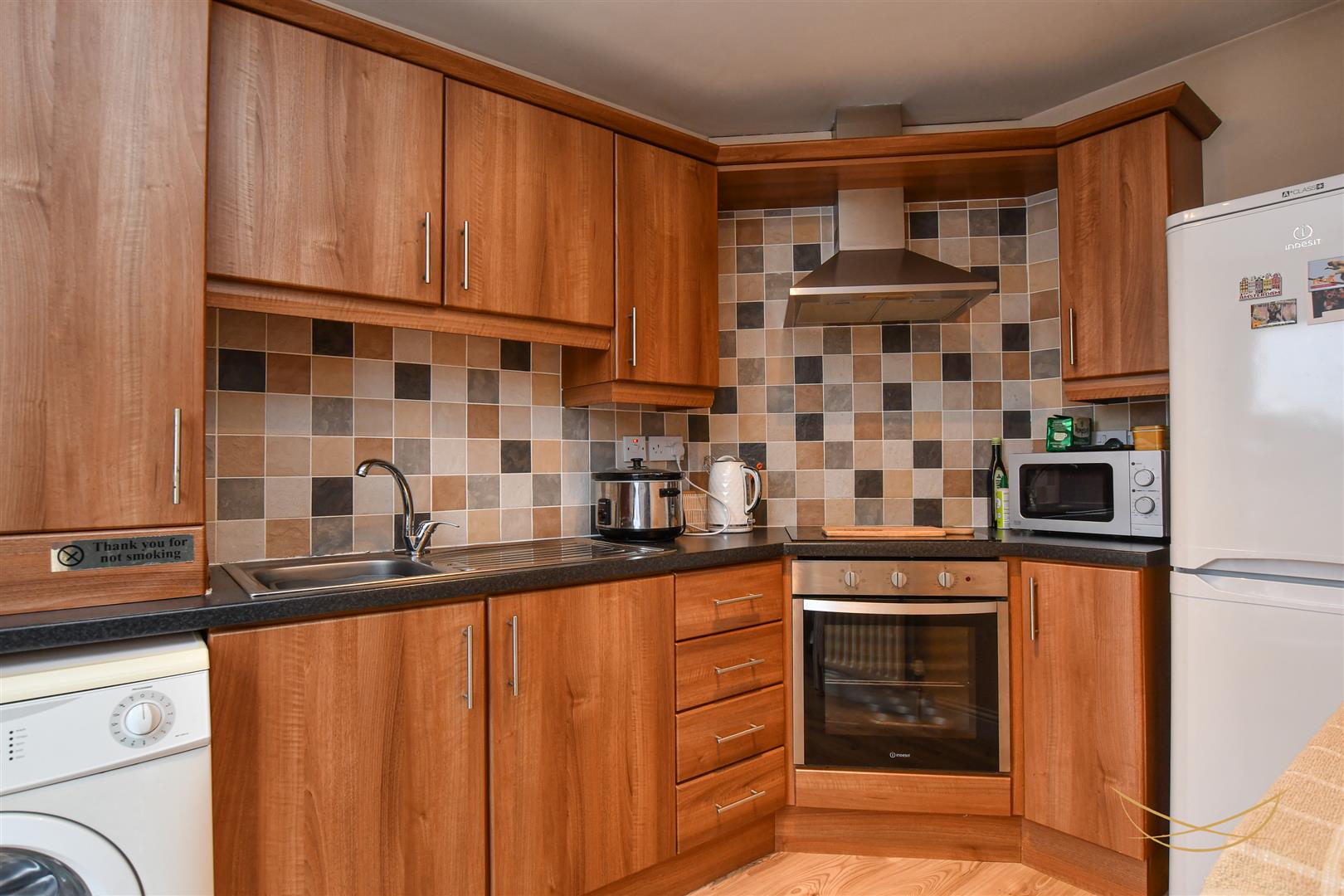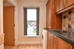 Range of high and low level units with formica worktops. Stainless steel sink unit with drainer and mixer taps. Integrated electric oven. Integrated electric oven. Stainless steel extractor fan. Space for washing machine. Laminate wood effect flooring. Tiled splashback.
