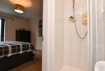 White suite comprising electric shower. Low flush W/C. Pedestal hand basin with mixer taps. Partially tiled walls. Tiled flooring.